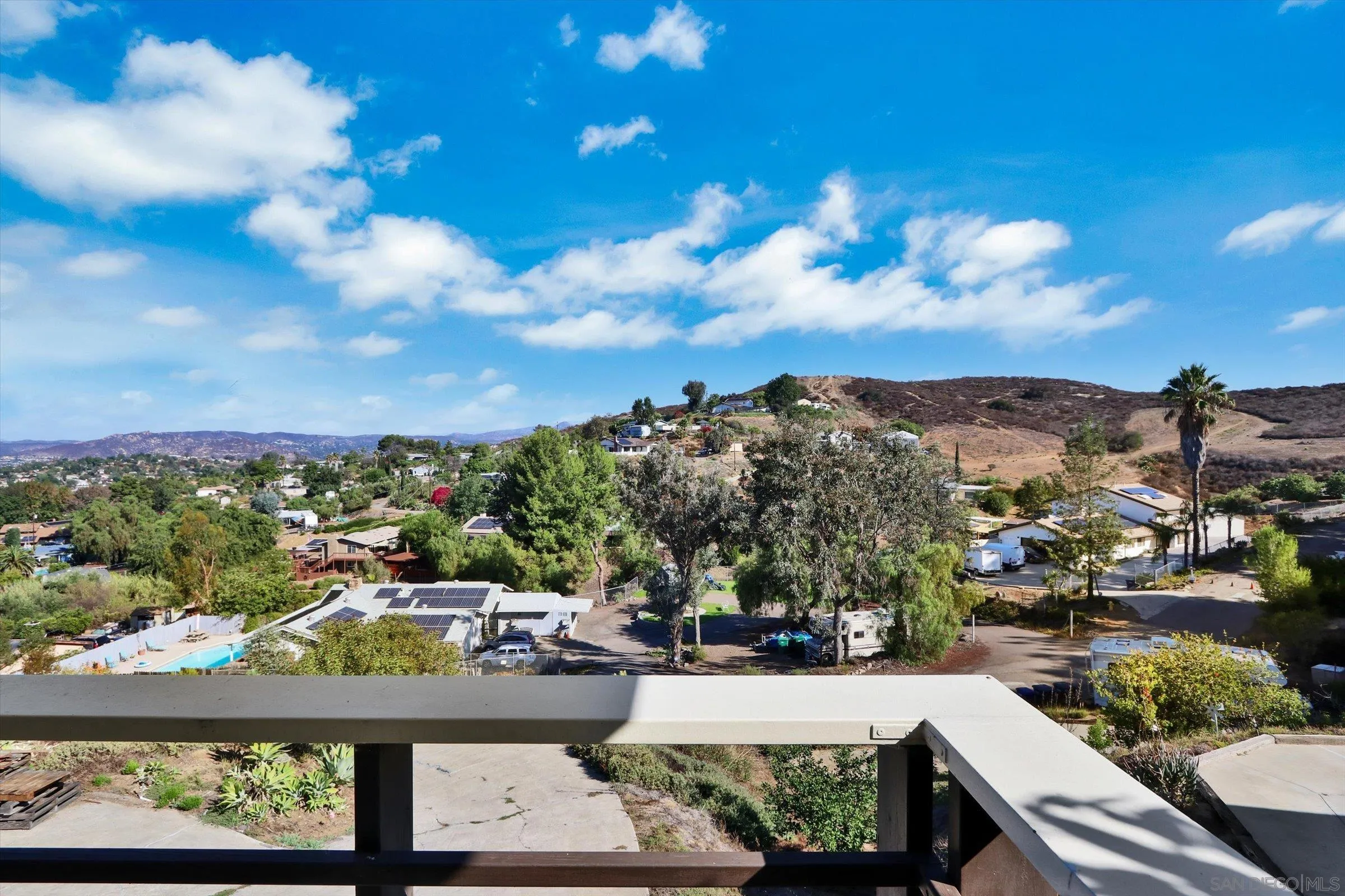 Resort-like hillside home with heated pool and spa. Amazing views on a quiet, private, no outlet street with great neighbors. Away from the noise, but just minutes from convenient shopping and access to recreation at local lakes and hiking trails. Underground utilities make for an amazing 180 degree view overlooking Winter Gardens and Eucalyptus Hills to Iron Mountain and Mount Woodson. Large parking pad for 3 cars plus boat/rv parking at street level with water spigot. Upgraded kitchen with custom cabinets, granite counters and all stainless steel appliances. Bathrooms include a new low flush toilet, all new brushed nickel faucets and matching cabinet handles, as well as new shower diverters. Entry, hall and large dining room feature hand hewned wood plank looking ceramic tile for a luxurious look with durability. Huge living room with wood/gas fireplace has solid exposed beam and incredible sunset views, with access to the large balcony offering even more views and a peaceful escape for morning coffee, watching local hawks and other wildlife or star gazing at night. Outside, the pool and spa have all new equipment, including programmable variable speed pump, gas heater and filter unit, as well as a Dolphin robotic pool cleaner, remote controlled multi-colored pool light and new pool tools. The backyard is fully fenced with separate dog run on side. There is a multipurpose storage/workshop/pool house with extended patio cover to finish as you see fit. New smart 8-zone sprinkler controller and valves. Fully owned solar w/ smart inverter results in near zero electric bills.