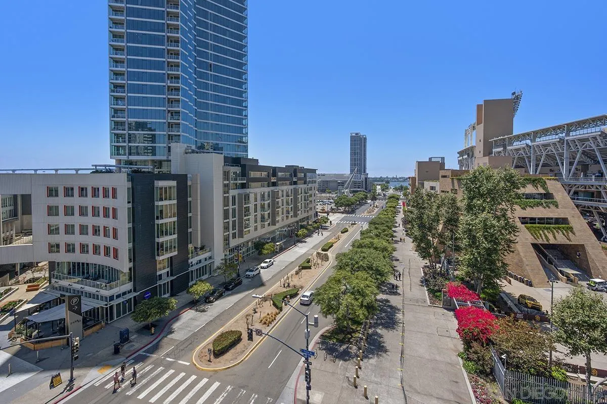This completely remodeled corner-unit residence at Park Terrace boats views of the San Diego Bay and Petco Park. JUST BARELY, but yes, you can even see home plate! This stunning home has been transformed top-to-bottom with beautiful light-toned engineered hardwood flooring throughout. Light-filled kitchen and living areas provide ideal separation between the two bedrooms. The chic kitchen features modern cabinetry, elegant quartz countertops and vivid recessed and pendant lighting, creating a sophisticated space for cooking and entertaining. The primary bathroom features a luxurious walk-in shower with custom tile surround and frameless glass, and large format tile flooring, all lit by stylish light fixtures. The second bathroom showcases an updated vanity and tile flooring for a fresh, contemporary feel. The expansive, private corner balcony invites both lounging and al fresco dining. You'll also enjoy in-unit laundry, PLUS side-by-side parking spaces in the underground garage. Park Terrace amenities include a fully equipped gym, recreation room with pool table & community courtyard with barbeques perfect for gatherings. The prime Ballpark District locale is conveniently situated across from Petco Park and within close proximity to a wide array of activities, shops & eateries, the Gaslamp Quarter, freeways, Balboa Park & Little Italy.