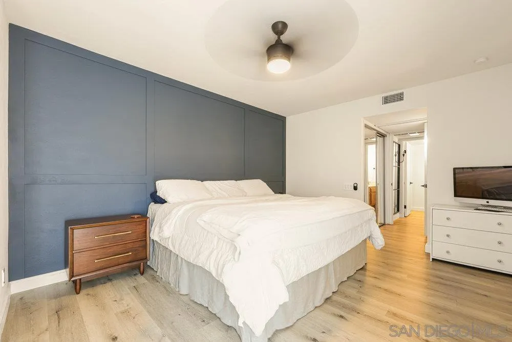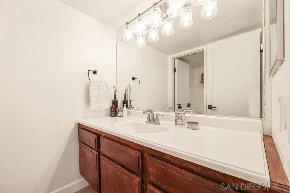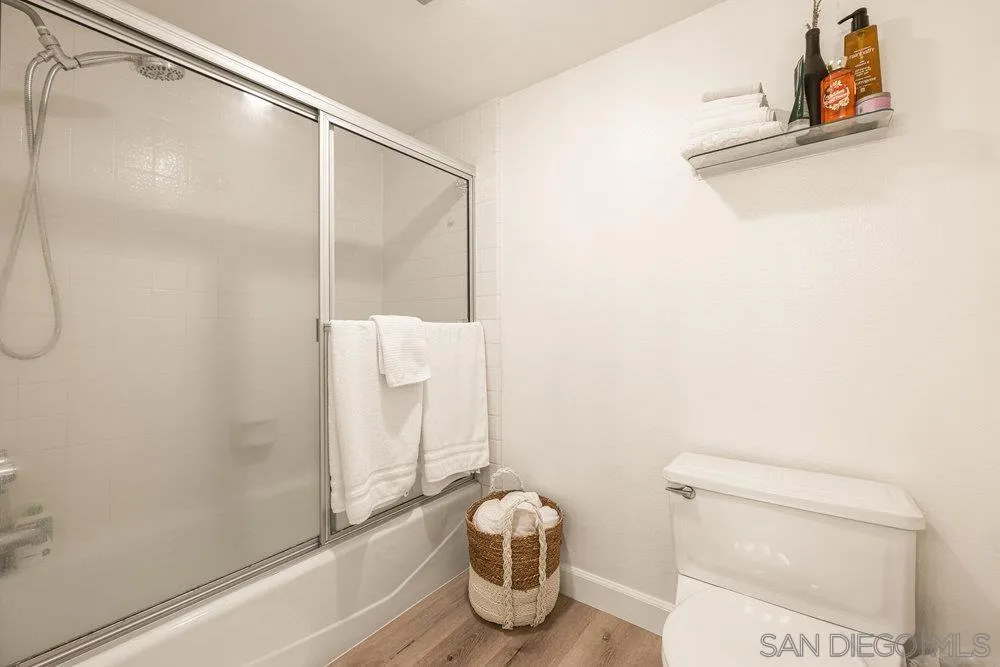 Surrounded by scenic canyons and trails, this move-in-ready condo in Villa Colina, Tierrasanta, offers the perfect balance of nature and convenience. Inside, the spacious open-concept layout features a fireplace, stylish vinyl plank flooring, neutral interior paint, and a ceiling fan for year-round comfort. A remote-controlled blind on the high entryway window, along with blackout drapes in the living room, provides both privacy and light control. Enjoy a private balcony that serves as an extension of your living area, complete with extra storage. The bedroom features its own ceiling fan for added comfort, blackout drapes, and a custom walk-in closet with built-in storage, providing organized space. The bathroom features a modern light fixture, a newer sink faucet, a newer toilet, and a convenient shower/bath combo. A rare, oversized two-car side-by-side garage features an epoxy floor, washer/dryer, and generous storage space, along with space for a home gym and a work/hobby bench, all with direct interior access. Enjoy access to nearby Shepherd Canyon trails, sparkling community pools, breathtaking sunset views, and the tranquility of nature, all within minutes of shopping, dining, and freeway access.