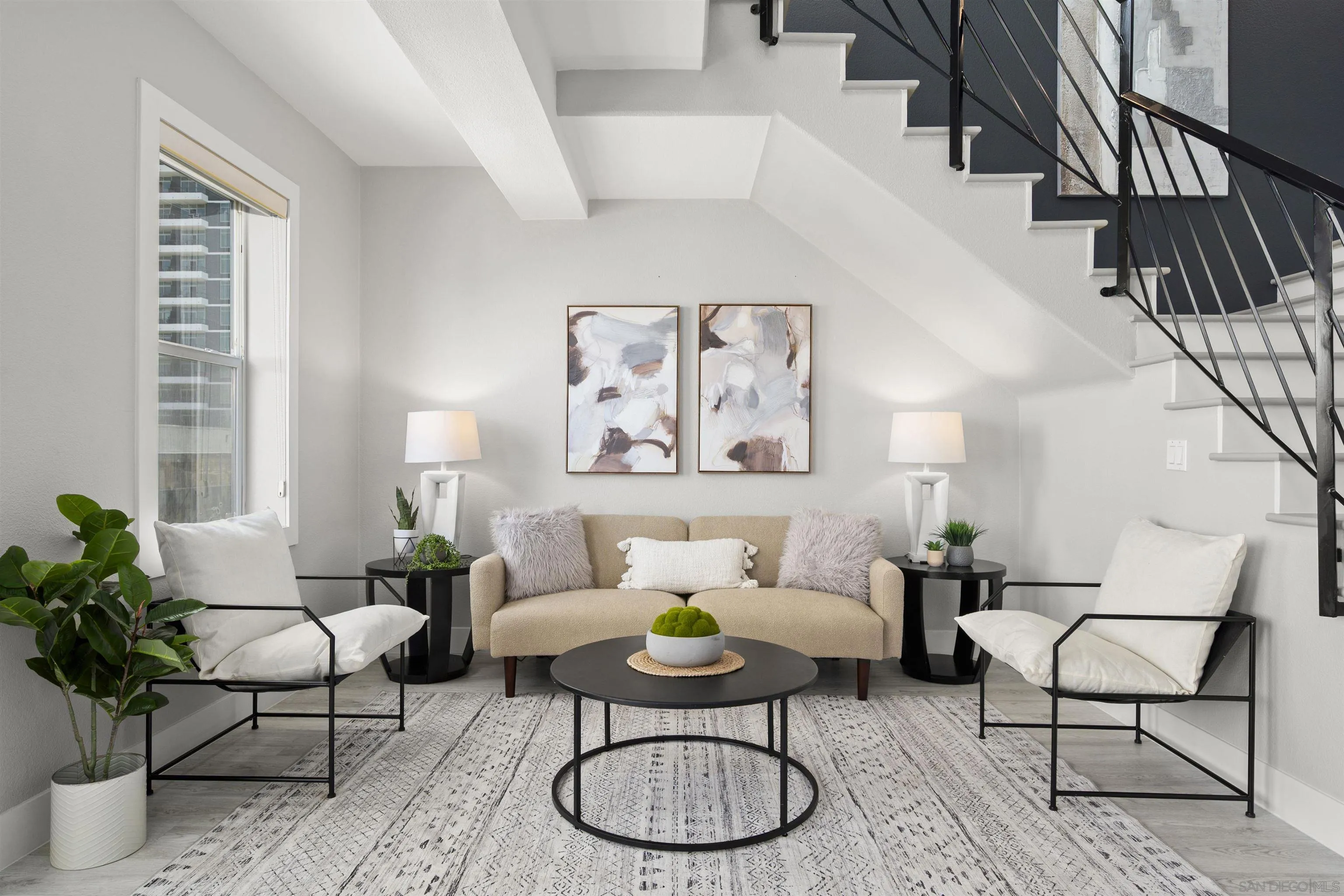PRICE IMPROVEMENT! TOP-FLOOR, CORNER UNIT, 2-STORY LOFT w/SPLIT GRAND STAIRCASE! Immerse yourself in the lively culture of LITTLE ITALY with its renowned restaurants, bars, and cafes like Born & Raised, Craft & Commerce, and the vibrant Piazza Della Famiglia. Enjoy proximity to the San Diego Bay, Waterfront Park, and the Farmer's Market, all within 3 blocks! This one-of-a-kind unit offers 1,055 square feet of modern living with an open loft-style bedroom and 2 full bathrooms. As you step inside, you'll be greeted by towering 20-foot ceilings and brand new luxury vinyl flooring. This fully remodeled kitchen features elegant marble counters with a wraparound bar, perfect for hosting and entertaining. Enjoy the convenience of an In-Unit Full Size Washer/Dryer, and unwind on one of the two oversized private balconies. This loft-style penthouse is thoughtfully designed with a double staircase adorned with custom wrought iron railings, providing an artistic touch to the space. The upstairs area offers a full bath, loft style bedroom, Walk-In Closet, Balcony, and automatic blinds. Downstairs offers 1 full bath and a flex-space to be used as an optional bedroom, den, or office. 1 assigned, oversized, underground parking spot, that includes storage and additional space options (see pics). Village Walk amenities include a beautiful common courtyard with a waterfall, large fitness center, and a community rec room for social gatherings. This top-floor gem offers the ultimate blend of comfort, luxury, and urban convenience. Make it yours today!