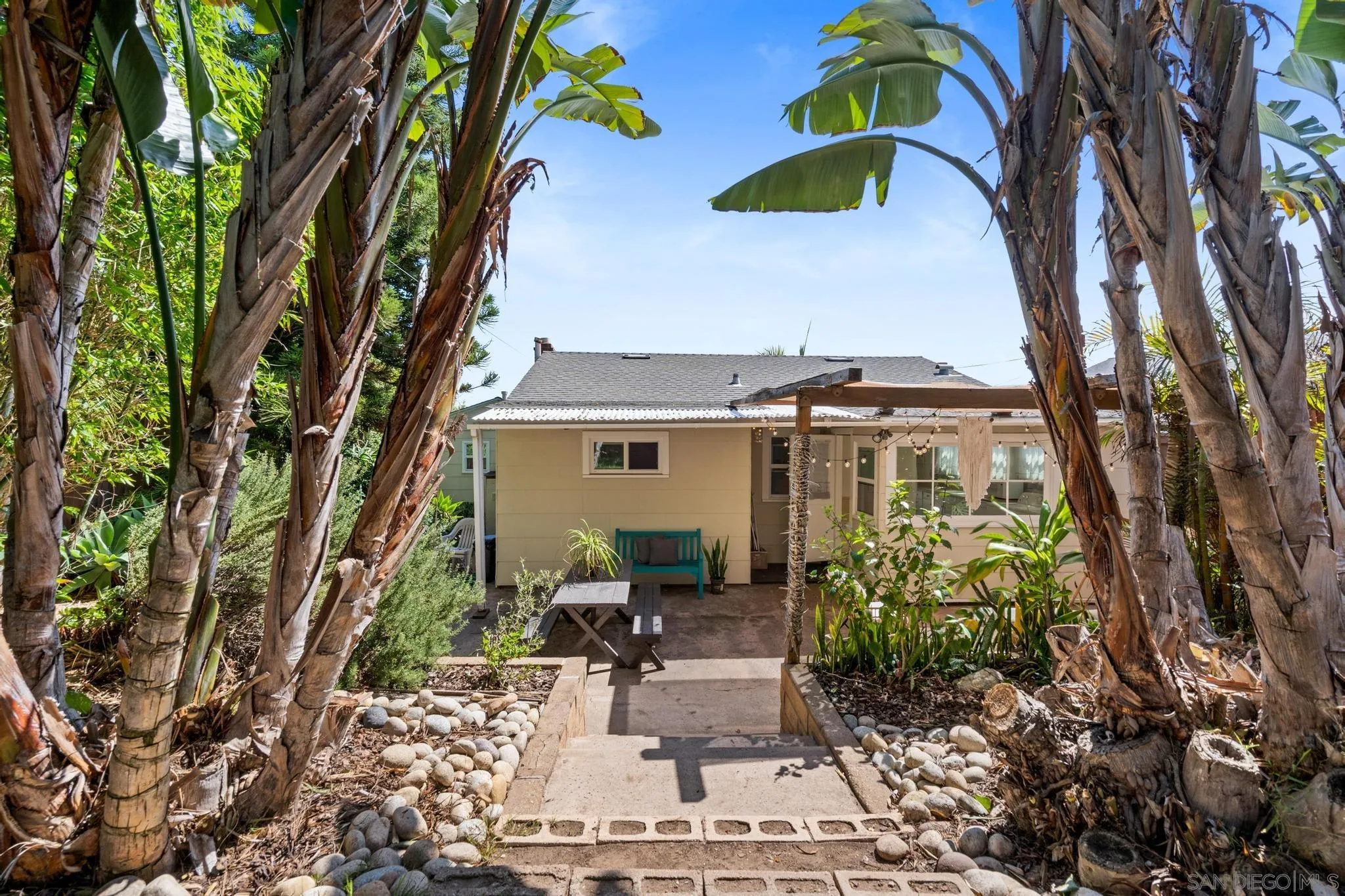 Amazing opportunity for a single-family home in North Pacific Beach! Perched on the hillside adjacent to Kate Sessions Park, this well maintained home gives you living and primary bedroom views of Mission Bay, City Skyline and seasonal fireworks. Interiors have tons of southern light & charm with a spacious living room w/fireplace, newer flooring, carpet, vinyl dual pane windows and additional Office/optional room off dining room - ideal for the home office or bonus room needs. Relaxing or entertaining in the backyard patio for BBQs & outdoor dining is where the magic happens— private, lush mature landscaping, alley access = full of potential. Think room for a pool/hot tub, ADU, add a garage off the alley, or the ultimate customized backyard.