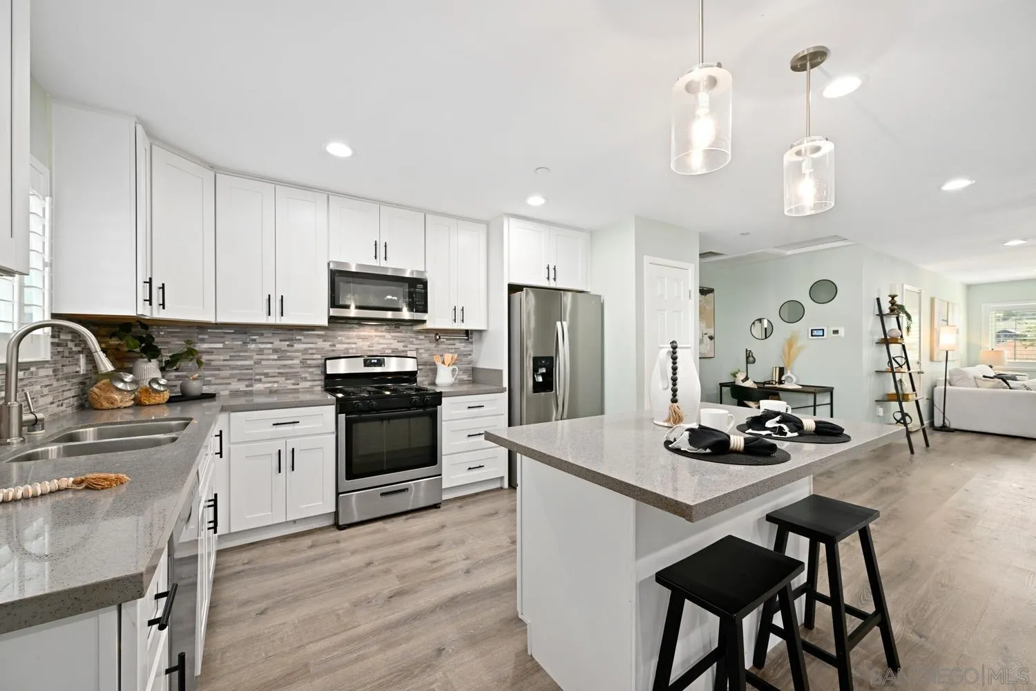 Beautiful newer construction, built in 2021, this home boasts a spacious open floor plan with wood laminate flooring throughout and elegant plantation shutters. Each bedroom is thoughtfully located in its own corner of the home, ensuring maximum privacy. Modern comforts include central heating and A/C, plus an attached 2-car garage with storage cabinets, a ceiling shelf, and electric car charging capabilities. The beautifully appointed kitchen showcases crisp white shaker-style cabinetry, a custom tile backsplash, quartz countertops, stainless steel appliances, and an island with breakfast counter seating. The spacious primary suite offers exterior patio access, ample closet space, and a private en-suite bathroom. The low-maintenance backyard features turf, stamped concrete, and a covered patio—perfect for outdoor entertaining—along with a storage shed for extra convenience. Additional highlights include RV parking and easy-care landscaping, combining functionality with style.