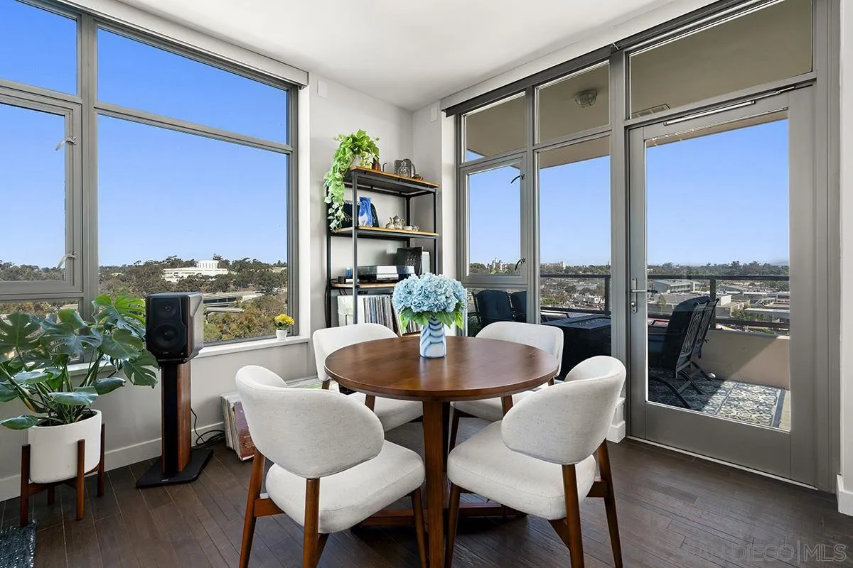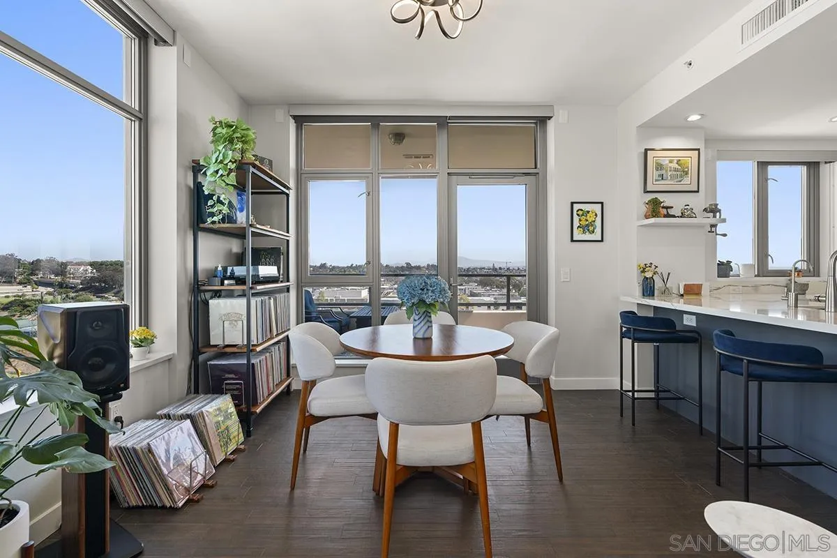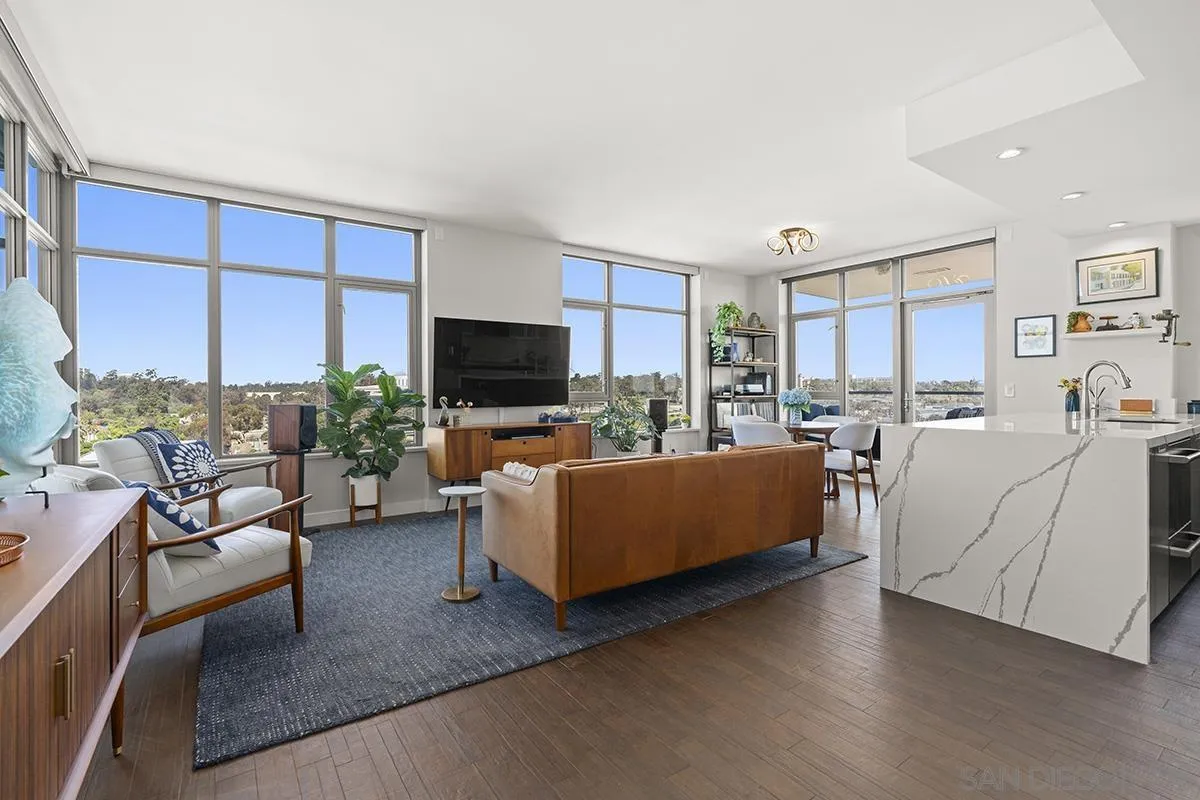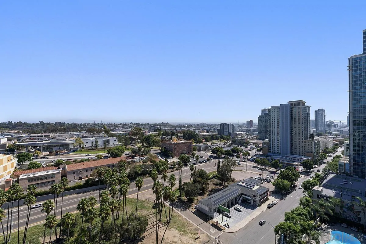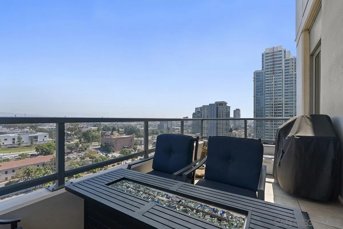 Perched on the 14th floor, this "Pride of Ownership" northeast corner residence at Aria impresses with sweeping 270° views of the city skyline, Balboa Park, distant mountains, and even glimpses of the Bay and Coronado Bridge. Enjoy the vibrant Downtown energy from your spacious private balcony—perfect for morning coffee or soaking in peaceful sunrises. Inside, the open living area dazzles with sleek ceramic wood-look tile flooring, floor-to-ceiling windows, motorized shades, and airy 9-foot ceilings that create a seamless blend of comfort and sophistication. The chef-inspired kitchen is a true showpiece, featuring Calacatta quartz countertops with waterfall edge and backsplash, an extended eat-at bar, Bosch induction cooktop, convection oven with air fryer, dual-drawer dishwasher, instant hot water faucet, and Gallery microwave. A custom-built coffee bar and beverage chiller elevate everyday convenience with a touch of luxury. The primary suite includes blackout shades and a beautifully upgraded ensuite bath with a glass shower enclosure and dual vanity, while the guest bathroom features a custom-built linen cabinet for added storage. Additional highlights include tandem parking and a private storage room conveniently located directly in front of the parking spaces. Set within the sought-after Cortez Hill neighborhood, Aria offers a serene residential feel just moments from Downtown’s finest dining, culture, and entertainment—modern luxury perfectly balanced with urban excitement.
