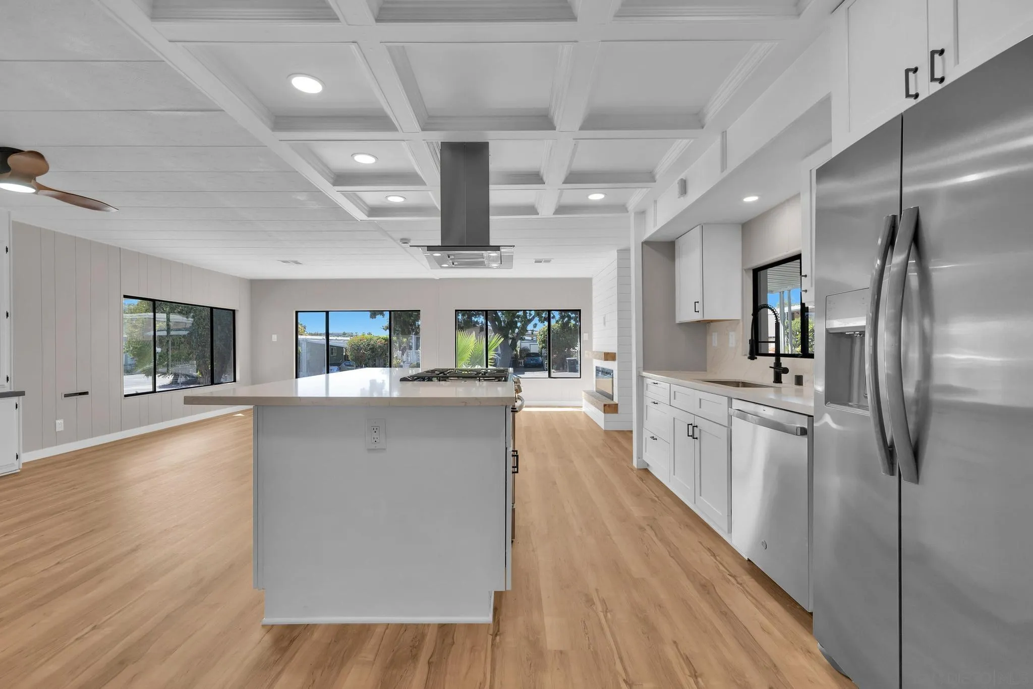 This stunning 2 bed / 2 bath 1,440 sq ft home has been fully renovated with modern finishes, and major system upgrades, and thoughtful design throughout. The bright, open floor plan features wide plank luxury flooring, fresh interior paint, designer lighting, and a beautiful shiplap fireplace feature wall with electric fireplace and wood mantel. The kitchen features a dramatic coffered ceiling with recessed lighting, oversized 52” island with bar seating, Calacatta-style stone countertops, and brand-new stainless steel appliances including a counter-depth refrigerator, 5-burner gas slide-in range, dishwasher, and modern stainless island hood. Both bathrooms have been upgraded with new stone countertops, porcelain undermount sinks, matte black fixtures, new mirrors, and refinished tub/shower enclosures. Major upgrades include: • Brand new 3-ton heat pump HVAC system • Home re-leveled with new piers and foundation supports • Roof inspected, repaired, and sealed • New plumbing vents and safety detectors • Under-home repairs including vapor barrier and duct work. Exterior improvements include fresh paint, repaved driveway, new exterior lighting, and entry porch. Too much to list, go see!