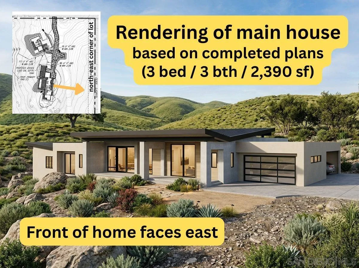 Location, location, location! Welcome to Hacienda Farms, one of West End Ramona’s most prestigious and sought-after enclaves. Located toward the north end of Hacienda Farms Ln, spanning nearly 12 pristine acres (11.91 AC), this expansive property offers a rare opportunity to manifest your dream lifestyle among rolling hills, nearby wineries, avocado groves and Mt. Woodson Golf Club, all with unparalleled 360-degree panoramic views. --- Skip the years of guesswork with a massive head start on infrastructure. Completed plans include: Grading, septic -AND- architectural plans and renderings for a modern 2,390 sqft single-story masterpiece, complete with a 1,200 sqft ADU. --- Perfectly positioned for the San Diego commuter, this site offers peaceful seclusion just minutes from SR-67. Zoned A70, it provides maximum versatility for those seeking a sprawling residential estate (with multiple home-site options) and/or agricultural enthusiasts. --- Utilities: Power on-site, enjoy the choice of Ramona city water and/or a private well. --- Lifestyle & Potential: Imagine sunrises over the valley and sunsets toward the coast. Whether your dream includes a hobby farm for the family, a boutique vineyard or a high-tech modern retreat, this is truly the premier lot in West End Ramona! Properties of this scale with this much legwork completed are rare. Bring your builder and your vision to Hacienda Farms. Welcome home.