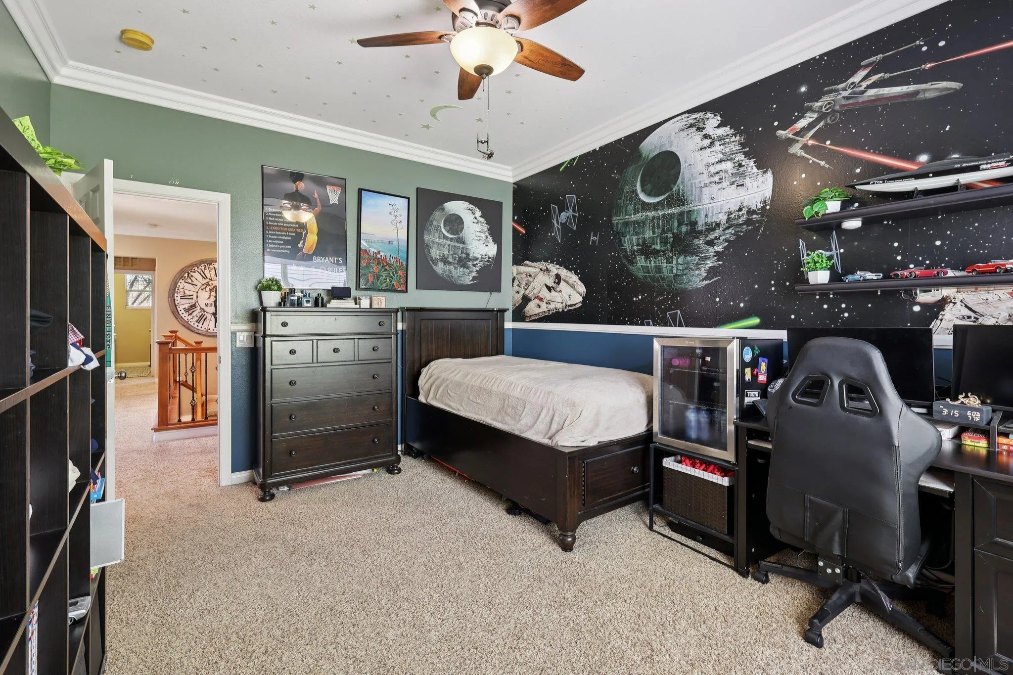 Welcome to this exceptional executive residence located in the highly sought-after Winding Walk community. Offering approximately 3,601 sqft this home features 5 BDRMs, 4 full BAs, & a versatile bonus/media room that can easily serve as a 6th BDRM. Ideal for multigenerational living with a full BDRM & BA on the main level. Impressive curb appeal with a stamped concrete driveway, mature palm trees, lush landscaping & private courtyard entry. The grand foyer showcases elegant ceramic tile with marble inlay, leading to living spaces enhanced by plantation shutters, crown molding, custom paint & upgraded iron staircase. The chef’s kitchen is both stylish & functional, featuring granite countertops & custom backsplash, double ovens, stainless steel appliances & walk in pantry. A large accordion-style cantina door seamlessly connects the kitchen & family room to the backyard, creating the ultimate indoor-outdoor living experience. The family room offers stacked-stone fireplace, custom built-in media cabinetry & surround sound for effortless entertaining. Upstairs, the luxurious primary suite serves as a private retreat with a spa-inspired bath, soaking tub, walk-in shower, dual vanities & a spacious walk-in closet. Additional highlights include SOLAR, upstairs laundry room with sink & storage, solar tube skylights for abundant natural light, & dual garages with epoxy flooring. Step outside to your private backyard paradise, complete with panoramic mountain views. Designed for entertaining, this outdoor space features a covered spa area, built-in BBQ island with sink, refrigerator