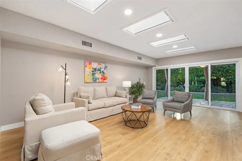 PRICE IMPROVEMENT!! Welcome to this beautifully remodeled one story Mid-Century Modern Gem! A bonus room connected to the rear of the home with a separate entrance puts the space over 3000 square feet! With classic architecture and thoughtful upgrades, this wonderful property is turnkey ready. Natural light pours in through large windows and multiple skylights, illuminating wide-plank flooring and creating a bright, open atmosphere throughout! The entire home has been thoughtfully upgraded, including windows, roof, floors, kitchen, bathrooms and more. The layout offers a variety of gathering spaces, perfect for both entertaining and relaxing. Whether you're in the expansive living room, the spacious family room with its artistic, contemporary fireplace, the formal dining room, or the oversized den, theres a sense of flow and connection in every corner. At the heart of the home, the remodeled kitchen combines function and style with quartz waterfall countertops, custom cabinetry, a casual eat-in area, and modern appliancesideal for hosting or daily living. Four bedrooms plus a spacious den (which can easily serve as a fifth bedroom) make this home well-suited for families or multigenerational living. Bathrooms have been beautifully updated with modern, designer finishes. Step outside to a private backyard oasis, designed with both beauty and sustainability in mind. Drought-tolerant landscaping is complemented by decomposed granite pathways, a drip irrigation system, with room for a pool. Enjoy the bounty of multiple fruit trees, including grapefruit, fig, pomegranate, strawb
