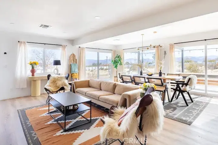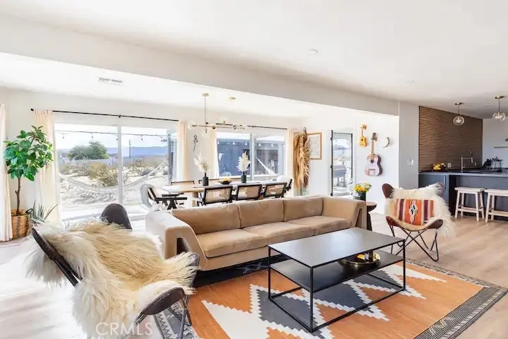 Welcome to Polaris Ranch! A fully gated, beautiful 2.5 acre horse property only 5 minutes from Downtown Joshua Tree, the property is close enough to all that Joshua Tree has to offer and far enough to provide you with the tranquility you seek in the desert. This designer gem offers a wide open floor plan with plenty of natural light, and with a living space that is perfect for entertaining. The living room features a hand troweled TV/entertainment wall upon which sits a wood burning fireplace to cuddle up by during the cool desert nights. The new modern kitchen will make any chef feel right at home and comes with all top rated appliances included. 3 spacious bedrooms, one of which connects to the en-suite bathroom that features double vanity sinks and a luxurious floor-to-ceiling tiled walk in shower. The other opens up to an al fresco secluded shower and soaking tub.a The fully re-designed exterior features a yurt, hammocks, cowboy pool and jetted jacuzzi. Also boasting Brazilian wood clad walls, a reed covered sun shade under which you can relax, and a courtyard that connects the main house to the workshop/shed that can be used for entertaining, an outdoor living space or your very own horse barn. (Note: Property consists of 2 lots that may have the ability to be split.)