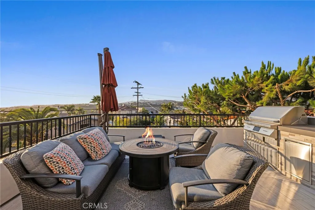 Bursting with character and coastal charm, this Spanish-style smart home in San Clemente offers luxury living in a prime location. Built in 2020, the residence features beautifully terraced landscaping and a dramatic staircase leading to the front entry. Inside, vaulted ceilings, a neutral palette, and French Oak hardwood flooring create a sophisticated ambiance. The spacious living room is anchored by a striking fireplace and custom barperfect for entertaining. Glass sliders in the dining area open to an ocean-view terrace ideal for indoor-outdoor living. The chefs kitchen is equipped with top-tier stainless steel appliances, built-in Sub-Zero refrigerator, white cabinetry, quartz countertops, and a large island with pendant lighting. All bedrooms are generously sized, offering ceiling fans, ample closet space, and a shared bath with a shower/tub combo. The luxurious primary suite provides direct backyard access and a spa-inspired ensuite featuring dual vanities, oversized walk-in shower, freestanding tub, and custom walk-in closet. Outdoor living is elevated by stunning ocean and Catalina Island views. Host guests on the sun-drenched terrace with a built-in Twin Eagles Pellet Grill or relax in the secluded backyard, complete with a covered pergola, dramatic fire pit, and oversized spool with a waterfall feature. Additional highlights include a laundry room near the bedrooms, elevator access on all levels, owned solar panels, EV charger, and an oversized 4-car garage with 12'4" ceilingsideal for installing a car lift. Located just minutes from downtown San Clemente, popula