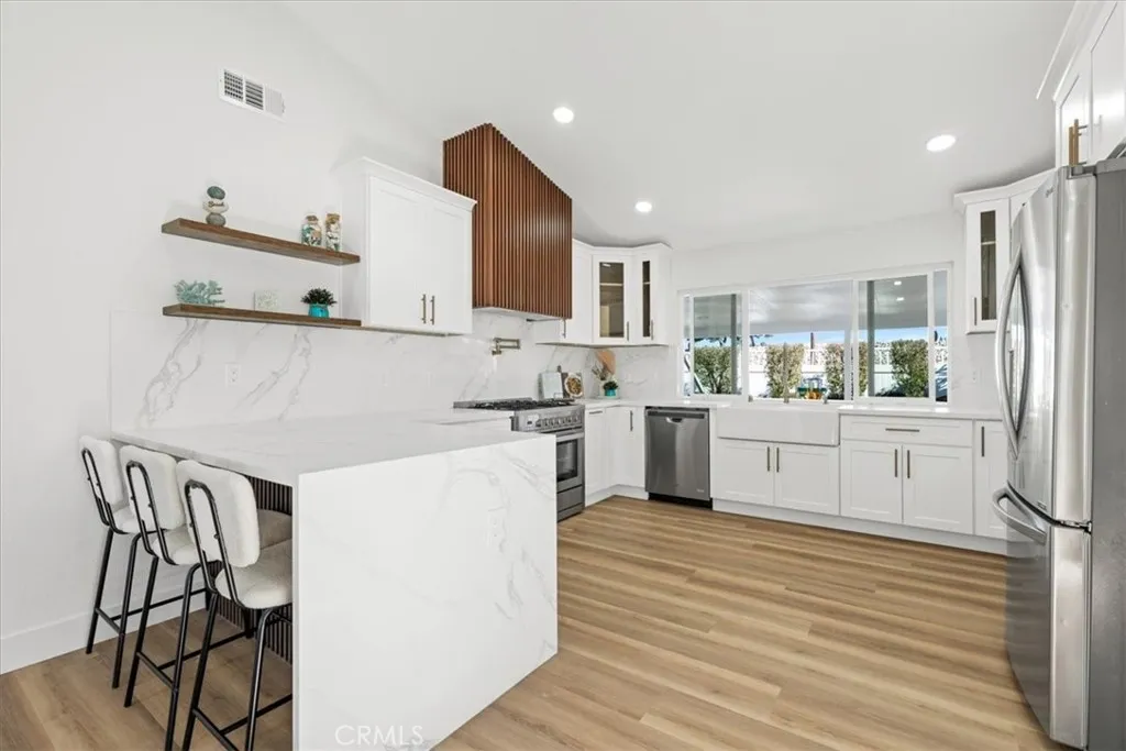 Coastal Living in Southwest Huntington Beach Tucked away in the peaceful southwest enclave of Huntington Beach and just minutes from the ocean, this stunning custom home captures the essence of luxury coastal living. With no neighbors behindjust the serene Huntington Beach Community Gardenthis property offers exceptional privacy and a tranquil backdrop. A double-gated entry opens to a beautifully landscaped, private front courtyard, setting the stage for the thoughtfully renovated interior. This home features a total of six roomsfour bedrooms, one dedicated home office, and one fully equipped theater/media roomincluding a sun-drenched living room with soaring cathedral ceilings, exposed wood beams, a sleek electric fireplace, and a contemporary ceiling fan. Central heating and A/C ensure year-round comfort. At the heart of the home is a chef-inspired kitchen with quartz countertops, custom cabinetry, a farmhouse sink, peninsula seating, and premium stainless steel appliancesincluding a 5-burner gas range and counter-depth refrigerator. A pass-through window opens to a custom outdoor quartz bar, ideal for effortless indoor-outdoor entertaining. The main level boasts a luxurious primary suite designed as a private retreat with a spa-like en-suite bathroom featuring dual vanities, a double walk-in shower, and a skylight. Also on the main floor are an additional spacious bedroom, the dedicated home office, and the theater/media room with dark accent walls, custom lighting, a motorized projector screen, high-end projector, and a quartz dry bar with built-in beverage fridge. A cu