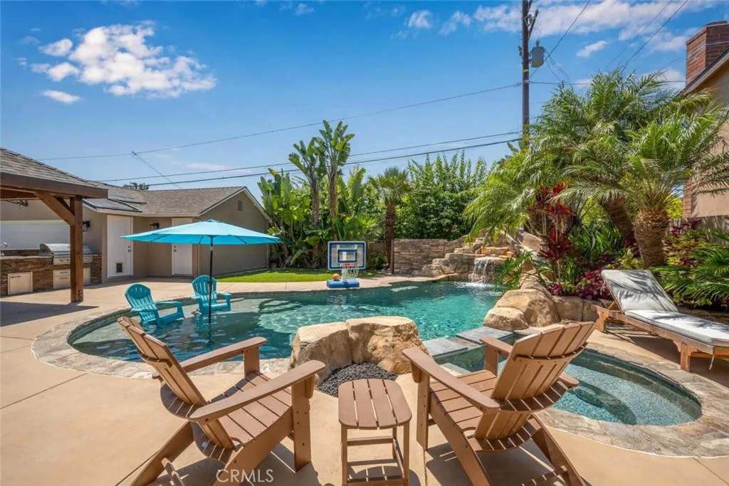 YOUR DREAM HOME AWAITS!! Welcome to this stunning 4-bedroom, 4-bathroom home offering 3,446 sq ft of beautifully updated living space in Rossmoor. Step inside to discover a bright and open layout featuring wood tile flooring, dual livings spaces, plus a massive upstairs bonus room. The updated kitchen boasts newly refinished white cabinets, elegant quartz countertops, a designer backsplash, and modern stainless steel appliancesideal for the home chef. Enjoy four spacious bedrooms, including two downstairs, two upstairs, and renovated bathrooms with stylish new vanities and custom tile showers. The tropical oasis backyard is a true showstopper with a sparkling pebble tech pool, jacuzzi, rock slide, waterfall, cozy fire pit, BBQ island, and a covered patio perfect for year-round entertaining. The long driveway leads to a detached back garage which includes an additional storage room and plenty of parking for recreational vehicles. Other updates include a full exterior remodel in 2023 with new windows, roof, and composite siding. The house is also equipped with smart home locks, lighting, AC, pool equipment and Tesla solar panels providing eco-friendly efficiency. From top to bottom, this home offers the perfect blend of luxury, comfort, and functionality in a prime Rossmoor location. Just a short stroll to Hopkinson Elementary and Rush Park, this entertainers dream is located within the award-winning Los Alamitos School District. Dont miss your chance to make this house your one-of-a-kind dream home!