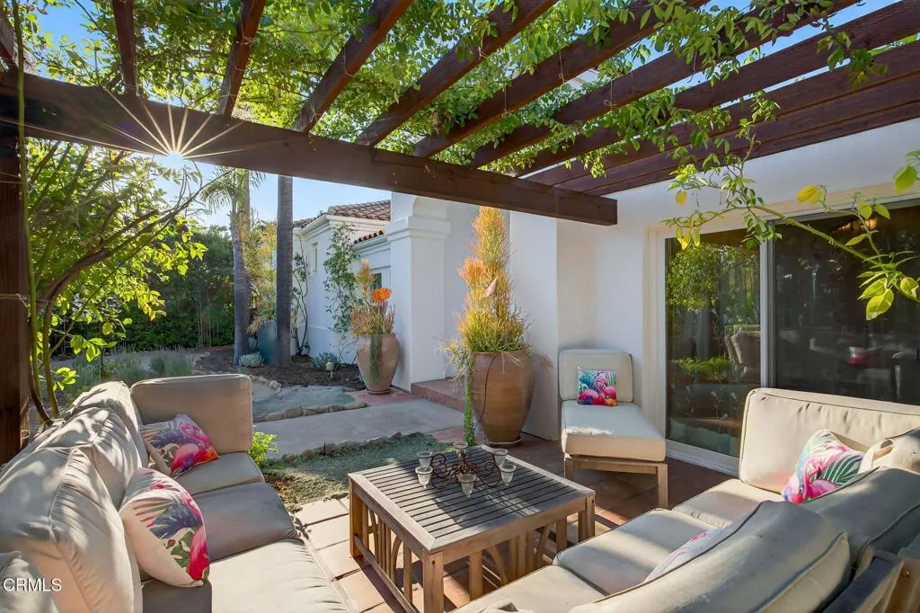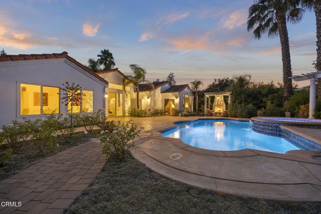 Luxurious Spanish-style living in a private Ojai setting. Welcome to 1454 South La Luna Avenue, designed with a contemporary interpretation of Spanish Mission-style architecture by the well-known and highly respected architect Barry Berkus. This home offers a seamless blend of indoor and outdoor living. Set behind privacy hedges at the end of a quiet cul-de-sac, the property offers a tranquil retreat just minutes from downtown Ojai. Step through the dramatic entry courtyard into a spacious single-story layout offering approximately 2,476 square feet of light-filled living. Vaulted ceilings in both the living and family rooms enhance the open feel, while large glass doors and tall windows throughout invite seamless indoor-outdoor living. Nearly every room connects to a patio, garden, or the stunning pool area, ideal for entertaining or quiet reflection. The layout features three bedrooms and two and a half bathrooms, with all bedrooms situated on one side of the home. A formal dining room off the entry adds to the home's thoughtful flow. The kitchen is a designer's dream, fully renovated and beautifully appointed. It is a space any gourmet chef will love, with high-end finishes and effortless flow into the family room and outdoor dining areas. Light wood floors and tasteful updates throughout reflect the quality of the renovation completed within the last decade. Outdoors, enjoy a resort-style experience with a sparkling pool and spa, surround sound speakers, a well-equipped outdoor cooking area with built-in grill, sink, and mini fridge, a cozy fireplace, meandering pathway