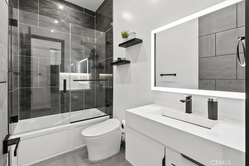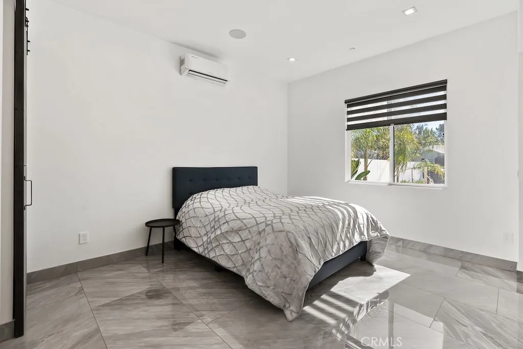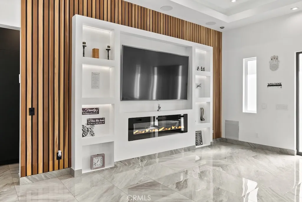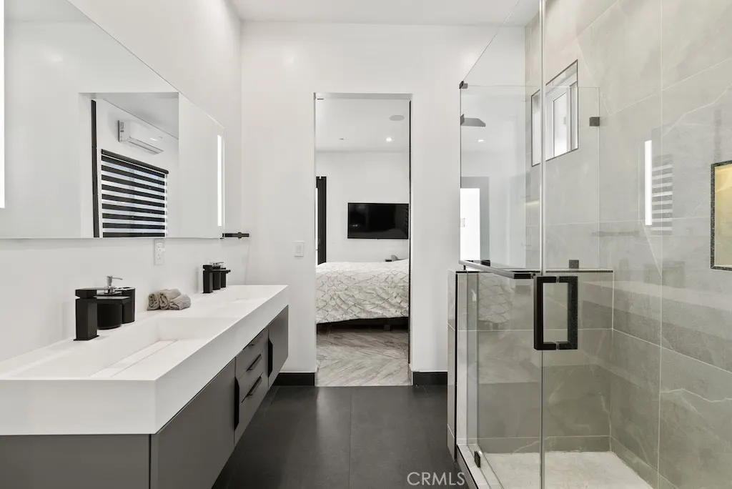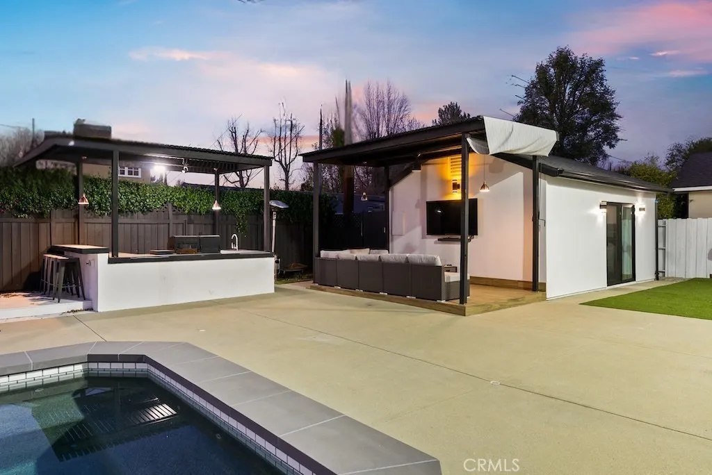 Welcome to this unique one-story modern masterpiece in the highly sought-after Walnut Acres Adjacent neighborhood of Woodland Hills. Fully rebuilt and reimagined, this expansive 3,300 sq. ft. estate offers 5 bedrooms and 4 bathrooms, including a detached guest house with 1 bedroom and 1 bathroom.From the moment you arrive, the electrical double-gated entry and circular driveway set the tone for privacy and elegance, providing parking for multiple vehicles, an RV, or even a boat. Step inside to a light-filled open floor plan with 14' soaring ceilings, bespoke Wisconsin hardwood accent walls, custom built-ins blended with soft LED lighting, and a striking modern fireplace that together create a warm yet sophisticated atmosphere. The chefs kitchen is designed for both beauty and function, complete with soft-close custom cabinetry, quartz countertops, a large island with breakfast bar, double sink, pot filler, high-end appliances, and plenty of workspace. The dining area, overlooking the backyard, creates the perfect setting for intimate dinners or lively gatherings. The primary suite is a serene retreat featuring vaulted ceilings, a massive walk-in closet, and a spa-inspired en-suite with dual faucets and a walk-in shower. Two spacious bedrooms share a modern Jack & Jill bath, while a junior suite offers its own walk-in closet & full bath. The detached guest house is a true bonus with its own fireplace, walk-in closet, and full bath, ideal for guests, a home office, gym, or rental income. Step outside to your private backyard paradise, a resort-style escape with a sparkling sa