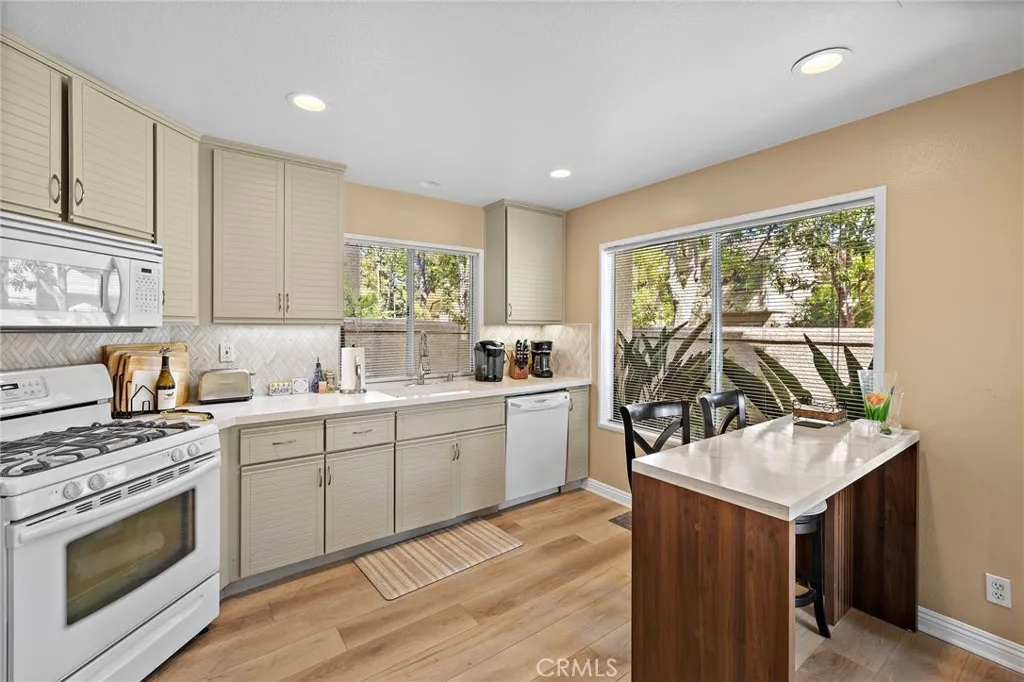 LOWER LEVEL | EASY ACCESS | FENCED-IN YARD | Welcome to 1 Encantado Canyon, a beautifully updated single-story end unit located in the sought-after Belterraza community of Rancho Santa Margarita. This light-filled 1,230 sq ft home features vaulted ceilings, an open-concept layout, an inviting fireplace, and stylish wood-like flooring throughout the main living areas. A spacious wraparound patio offers the perfect space for both relaxing and entertaining. The kitchen is equipped with Corian countertops, a modern tile backsplash, and direct patio access, while the primary suite includes cozy carpet, dual closets, a spa-inspired bathroom, and private access to a serene patio with a mature lemon tree. A second bedroom and full bath provide flexibility for guests or a home office. Additional highlights include fresh interior paint, two single-car garages (one with direct entry and laundry), low HOA fees, and access to SAMLARC amenities such as pools, parks, and a private beach club making this home a perfect blend of comfort, convenience, and prime location. Rancho Santa Margarita has been voted the Safest City in California multiple times, and in 2025!