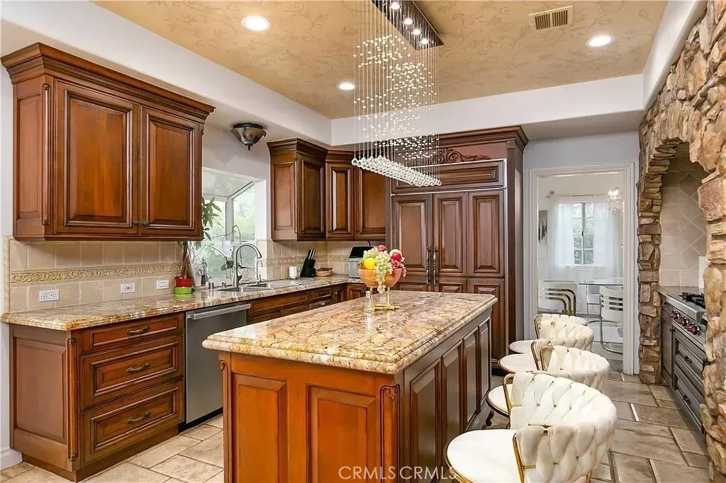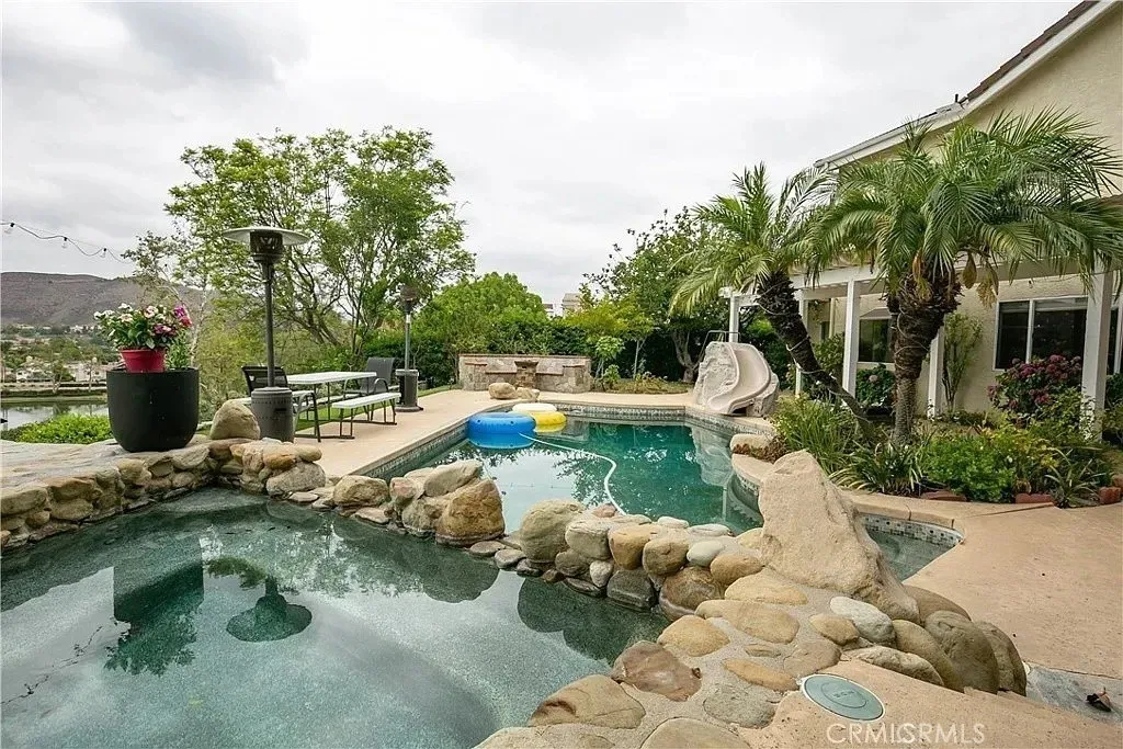 Commanding lake-and-mountain views set the tone for this resort-style highly sought after luxurious Wood Ranch Community pool homeTake in the endless panoramic views with this light-soaked showpiece where soaring ceilings, a sweeping staircase, and four fireplaces create an elegant backdrop for everyday living and effortless entertaining. The remodeled chefs kitchen pairs custom cabinetry and granite countertops with a six-burner Wolf range, Sub-Zero refrigeration, custom stone finishes, double ovens, Miele dishwasher and a large walk-in pantryA center island and breakfast nook open to a spacious family room, fireplace and the backyard oasis. Upstairs, the primary retreat pampers with a private view balcony, dual closets, and a spa bath featuring a steam walk-in shower and jetted claw-foot soaking tub. Flexible plan offers 5 bedrooms / 3 baths; one bedroom is thoughtfully outfitted as a main-level office with an adjacent full bathideal for guests, multi-gen living, or work-from-home. Outdoors, lush landscaping frames a rock-edged pool & spa, built-in BBQ/outdoor kitchen, fire pit, solar panels, and multiple seating areas to savor golden-hour sunsets over the water surrounded by lush fruit trees including, apple, lemon, peach and moreResidents enjoy keyed access to a nearby private lake and roving neighborhood security. Community highlights include: Rancho Madera Community Park (Wood Ranch) a destination park with lighted walking path, amphitheater, tennis & basketball courts, ballfields, soccer field, sand volleyball, gazebos, BBQ/picnic areas, restrooms, and playgroundspe