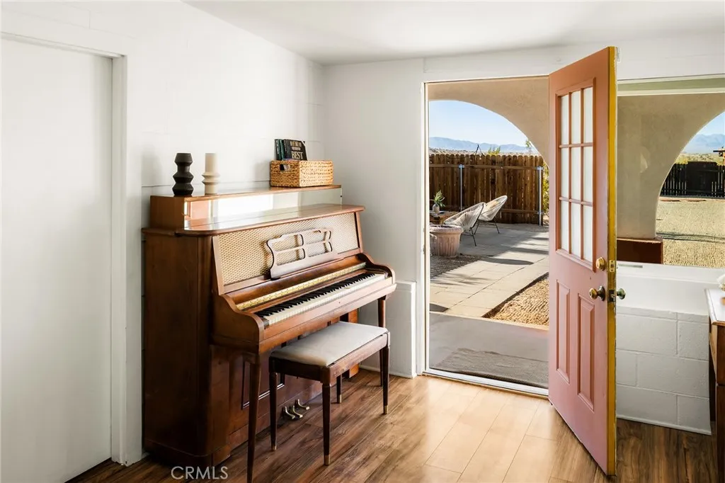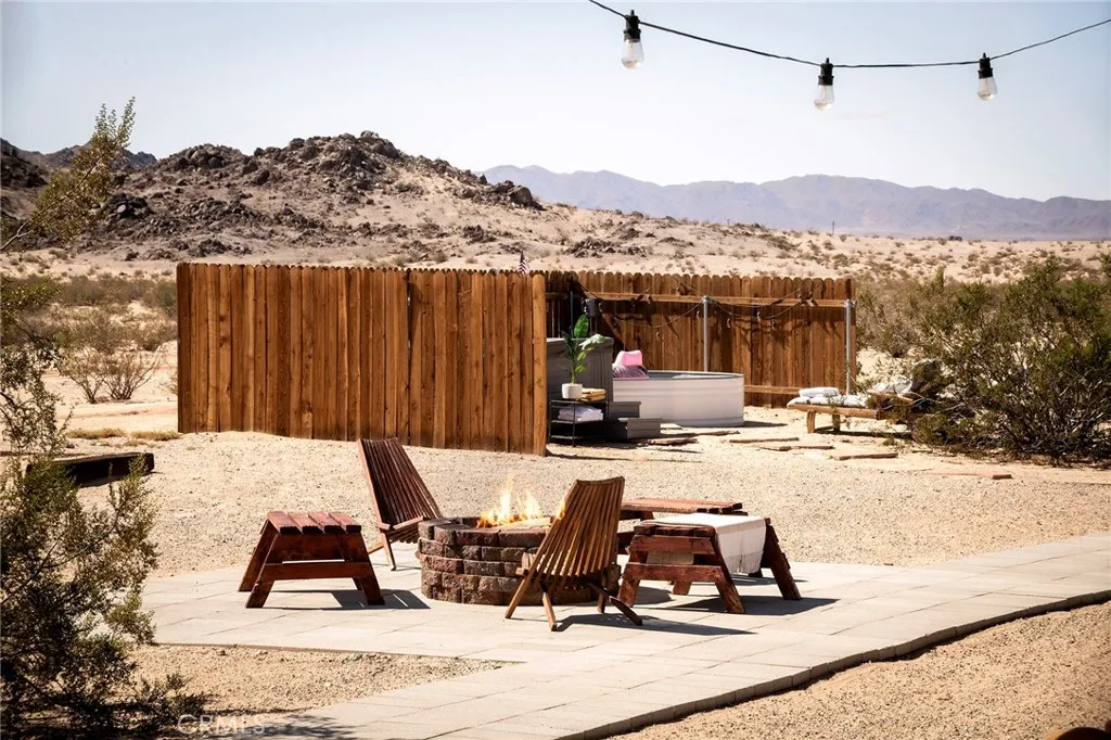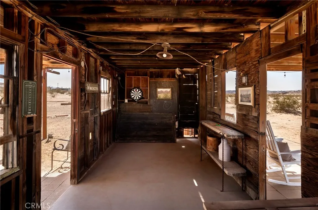 Welcome to Los Arcos, a striking Joshua Tree escape set in the heart of Wonder Valleyone of the most beautiful rural communities in the High Desert, known for its quiet solitude and some of the darkest skies in the Joshua Tree area. Here, stargazing is not just an occasional treat, but a nightly spectacle. This colonial Spanish ranchinspired estate, with a playful 1950s twist and its own Wild West saloon, rests on 5 private acres framed by mature trees and dramatic desert vistas. The property offers a rare combination of privacy, character, and convenience, located just 15 minutes from the eastern entrance of Joshua Tree National Park and downtown Twentynine Palms. Currently operating as a successful short-term rental, Los Arcos is being sold fully furnished and turn-key, ready to continue its legacy as a beloved desert retreator to become your own private oasis in the High Desert. Inside, the home is surprisingly spacious, with an open and inviting flow designed for comfort and entertaining. The updated kitchen blends retro charm with modern conveniences, while the bathrooms have been refreshed with thoughtful finishes that honor the homes style. Multiple living areas provide room to gather or retreat in peace, capturing the easy rhythm of desert life. Outdoors, Los Arcos invites you to linger. The grounds feature a spa, cowboy tub, outdoor shower, firepit, and hammocks for slow afternoons. Multiple shaded seating areas, framed by the propertys beautiful arches, offer cool respite from the sun. The original homestead cabin adds a layer of history and charm, while the attac