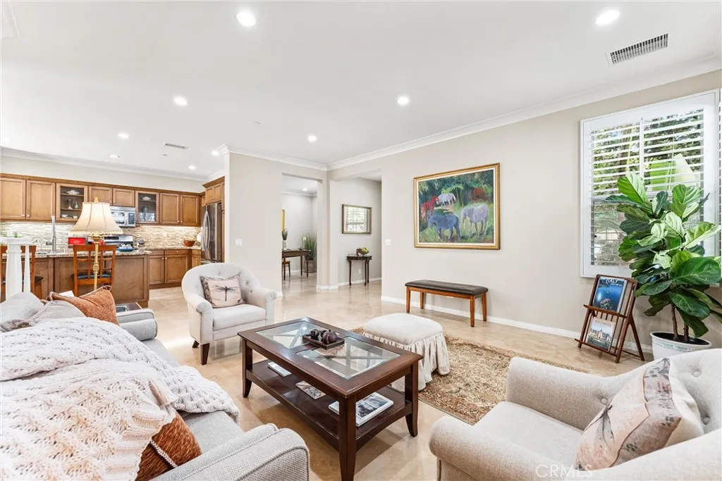 Located on a quiet interior street, this popular Monterey Plan 3 in the master-planned community of Woodbury East showcases architectural sophistication, highlighted by abundant windows and doors, an inviting front porch, and a charming courtyard. Adding to its curb appeal is a rarely seen upper deck that enhances the handsome front faade and distinctive architectural character. 3 bedrooms, a den, & 2.5 baths, with high-end custom upgrades at every turn. As you enter, timeless staggered travertine flooring flows throughout the entire first floor. Brand-new carpet on the staircase and second floor was carefully chosen for both elegance and comfort. A light-filled, expansive living room opens to a gourmet kitchen with a large central island. Situated at the heart of the home, the kitchen boasts granite countertops, a full backsplash with glass/natural stone mosaics, custom cabinetry with glass-paneled doors, under cabinet lights, and stainless steel appliances. Fresh interior paint, including baseboards and walk-in pantry shelves. The spacious dining area features a sliding glass door, opening to an enchanting courtyard, beautifully landscaped with staggered tiles, mosaic accents, & fruit treesperfect for indoor-outdoor living. The primary suite includes a private deck and a luxurious ensuite bath, upgraded with marble countertops, a marble tub surround, and a walk-in shower. Mirrored closet doors & high-end built-in closet organizers in all 3 bedrooms. A den by the front entry is ideal for a home office. LED recessed lighting with dimmers in every room, plantation shutters,