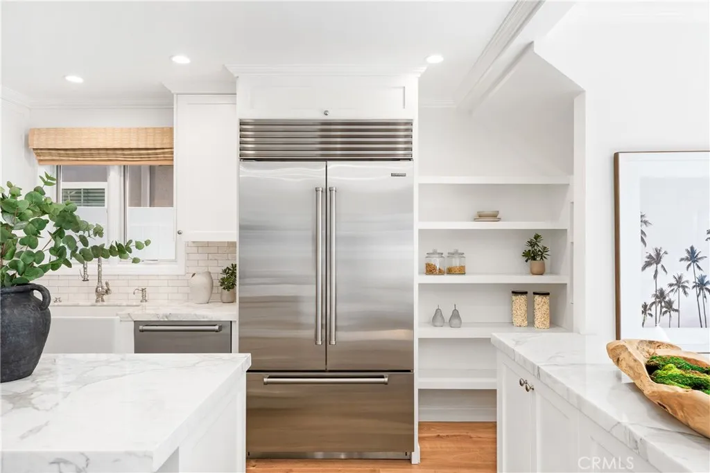 Outstanding opportunity to own a turnkey 4-bedroom, 3-bath home in a prime 100-block location on Balboa Island, just four doors from South Bayfront. The spacious front patio offers Bay views and opens to the first level with an open floor plan, living room with fireplace, dining area, family room, and a bedroom with en-suite bath. The remodeled kitchen features quartz counters, custom cabinetry, a large island, and Wolf and SubZero appliances. Upstairs, the primary suite showcases vaulted ceilings, a fireplace, built-ins, and a covered deck with Bay views. Two additional bedrooms and a bath, a second family room, and a separate laundry room complete the second level. A rare chance to experience the best of Balboa Island living.