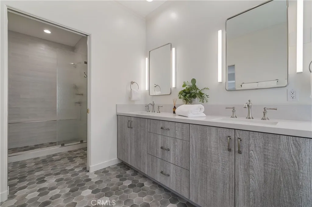 Just two blocks from Warner Avenue Elementary in Little Holmby is this fabulous 2-story courtyard Spanish that has a wonderful traditional floorplan and lots of original vintage details alongside brand new updates throughout. The large welcoming Saltillo-tiled front courtyard is perfect for entertaining al freso style. At the entry, is a large original front door flanked on the inside by two coat closets with super cool original pirate ship detail on the doors. The vaulted wood ceiling in the Living Room is supported by three charmingly stenciled trusses. This grand formal space also features a large picture window, stately fireplace and doors out to both the front and side patios. The formal dining room, also with french doors to the front patio, has space enough for a table set for 10-12. The just-renovated Kitchen with eat-in nook overlooking the Backyard has custom light wood cabinetry, new Thermador refrigerator, microwave and dishwasher suite, a new Viking vent hood over a vintage just-restored Viking 6-burner range with double oven. The adjacent Service Porch has a step-in pantry, plentiful storage around the washer & dryer hook-ups and a door to the backyard. Rounding out the main floor are a cozy Den attached to an updated full Bathroom. The second floor features three Bedrooms including a big Primary Suite that has an extra-deep walk in closet and brand new Primary Bathroom with a dual sink vanity, separate tub and large stall shower. There are two additional Bedrooms, each with spacious storage and that share a Jack and Jill Bathroom with stall shower and new van