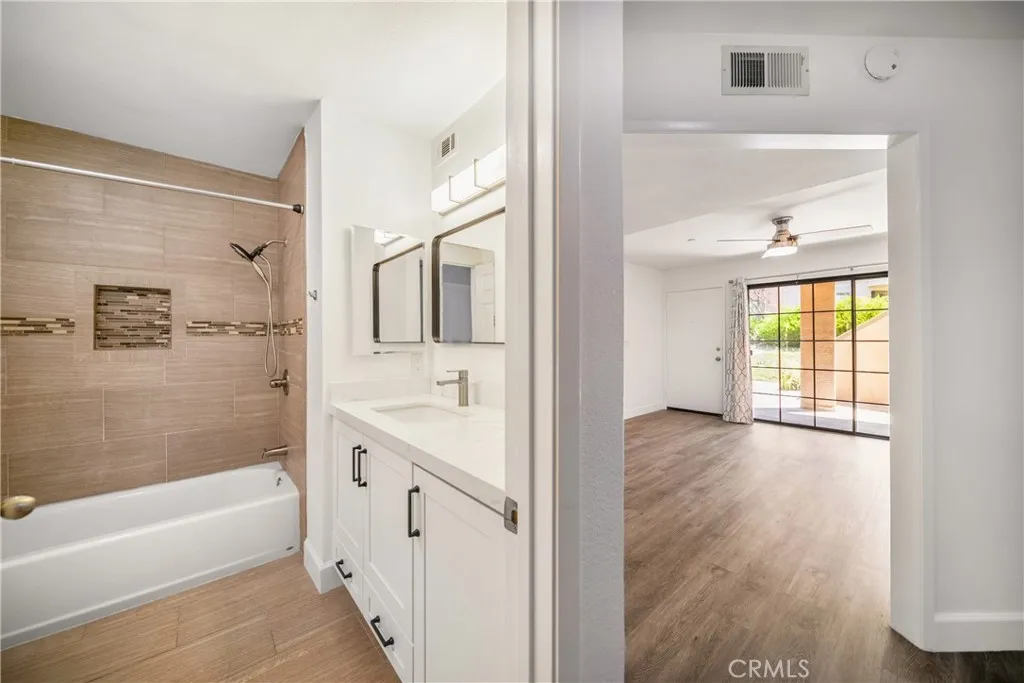Wake up to ocean breezes and coastal charm in this ground-level, fully renovated 1-bedroom, 1-bathroom condo located in the sought-after Vista Pacifica community. Modern upgrades, resort-style surroundings, and a prime location near the beach create an ideal retreat. The open-concept interior is filled with natural light, featuring new flooring, fresh paint, and remote-controlled ceiling fans for year-round comfort. The living area extends to a private ground-level patio through expansive sliding glass doors, perfect for savoring morning coffee or evening sunsets in a tranquil setting. The kitchen blends style and functionality with quartz countertops, white shaker cabinets, a subway tile backsplash, and stainless steel appliances including a refrigerator, microwave, stove, dishwasher, and freestanding wine cooler. A breakfast bar with additional storage cabinetry adds convenience and extra space, perfectly integrating the wine cooler. The bedroom includes mirrored closet doors and access to a fully updated bathroom with a modern quartz-topped vanity and a fully tiled shower/tub combination. A stackable washer and dryer are included inside the unit. Additional features include a 1-car detached garage with code access, providing secure parking and extra storage. Vista Pacifica offers a true coastal escape with two sparkling pools, two spas, meandering streams, and peaceful waterfalls surrounded by lush landscaping. Assigned parking and ample guest parking enhance everyday convenience. Located just minutes from sandy beaches, scenic hiking trails, dining, boutique shopping, a