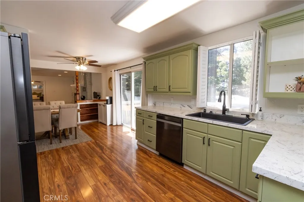 A prime piece of Running Springs real estate in San Bernardino County. This 3-bedroom, 3-bathroom single-family residence offers 2,218 square feet of updated living space on a 6,400 square foot lot. Great for families, outdoor lovers, or investors, it combines rustic charm with modern amenities for comfortable mountain living. Enter through the convenient mud room, a must for snowy days, into an open main floor featuring a renovated kitchen, stainless steel Samsung appliances, custom shaker cabinets, and a breakfast bar great for casual meals. The adjacent dining area flows seamlessly into the living room, highlighted by a wood-burning fireplace and large windows showcasing tree-lined views. The primary bedroom suite includes a walk-in closet and a separate bath with dual vanities, while a second bedroom and a full bath complete this level. Downstairs, the versatile lower area has been reimagined as a gym and entertainment space, boasting a dedicated workout zone with room for equipment, a game room for billiards or gaming, and a spacious family room with another fireplace for movie nights or gatherings. A third bedroom, additional bath, and laundry room add functionality, with potential to create a separate in-law suite. Recent upgrades elevate this home: newly installed central air conditioning ensures cool summers, an electric vehicle charger station in the 2-car garage supports green living, energy-efficient LED lighting, fresh interior paint, and updated bathrooms. Outside, the fully fenced yard provides privacy, a deck for barbecues, ample parking for RVs, boats, or m