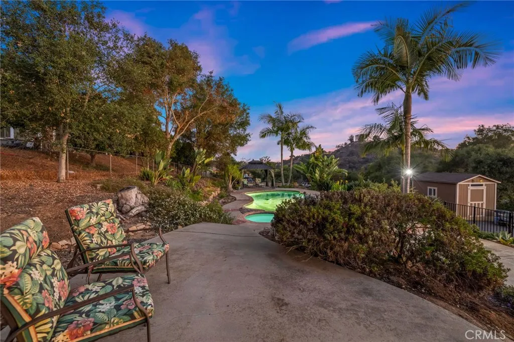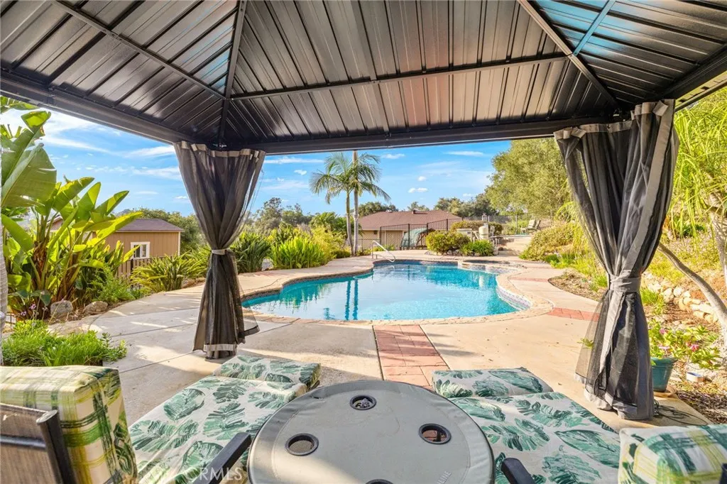 Preview the 3D Matterport tour. Set on 1.33 acres, this well maintained turn key Fallbrook ranch retreat blends timeless tradition with modern comfort. Elevated among oak trees with sweeping valley and hill views, the single-story 2,589 sq ft layout offers 3 bedrooms plus a spacious office/bonus room (That could easily be turned into a 4th bedroom) with plenty of storage throughout. The private primary suite features an updated shower and walk-in closet, while the secondary bedrooms include custom closets and barn-style doors. The inviting kitchen pairs concrete countertops with a breakfast bar for easy everyday living. Outdoor living shines: a sparkling saltwater pool and spa (with new pool vacuum), expansive view decks, a private covered lanai, and a 1014 screened gazebo overlooking a beautiful pool deck. Youve also got 2 flat meadows with water throughoutperfect for farm animals, horses, or even a work shop, plus a Tuff Shed, and a greenhouse for gardening and protecting your plants. Parking is easy with a 3-car garage (covered) and 5+ additional spaces. Thoughtful upgrades add peace of mind: steel gutters on all sides, WiFi-controlled automatic sprinklers (for garden areas), smart garage door remote, whole-house water filtration, newer HVAC, whole-house fan, installed drainage for the retaining wall and pool deck, and a 205-gallon rainwater catchment tank. Landscaped with low-water California native, fire-wise plantings and bird-friendly gardens, the property includes two large flat pads ideal for an orchard, animals, or a workshop, plus an access road and driveway that