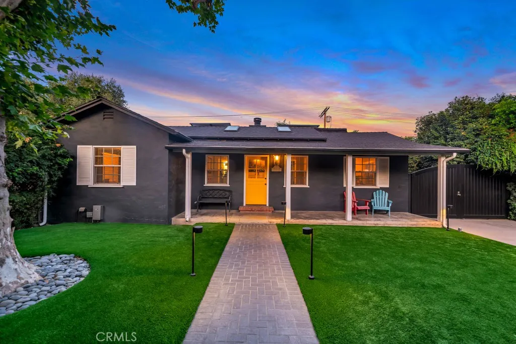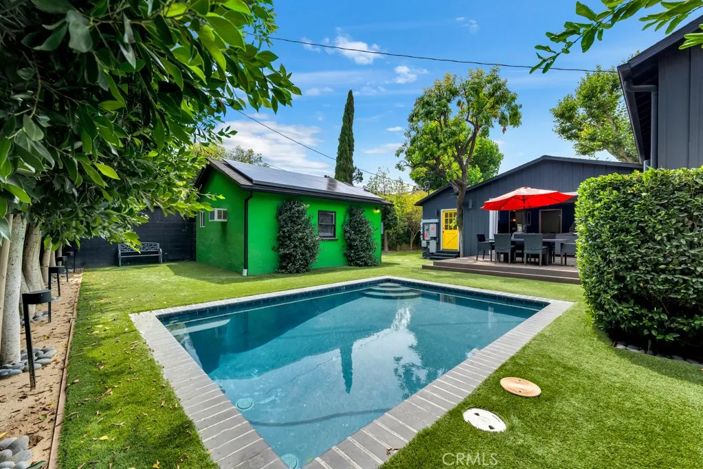 BACK ON THE MARKET! IT WAS ON THE MARKET FOR 37 DAYS BEFORE GOING INTO PENDING STATUS, BUT THE BUYER WITHDREW WITHOUT ANY ISSUES RELATED TO THE PROPERTY AND TO NO FAULT OF THE SELLER. This beautifully transformed and expanded home features 4 bedrooms and 3 bathrooms, making it a true gem! The primary residence includes 3 bedrooms and 2 bathrooms, while the accessory dwelling unit (ADU) offers a cozy studio layout with 1 Bathroom. The Main House consists of its soaring vaulted ceilings and open, airy layout, this residence showcases top-notch finishes and exceptional indoor/outdoor living. A charming Dutch door welcomes you into the cozy formal living room, featuring a sophisticated stone fireplace as its centerpiece. The seamless flow of the open-concept design leads you effortlessly into the dining area, which is beautifully highlighted by a striking architectural light fixture. The contemporary kitchen is a chef's dream, complete with custom cabinetry, quartz countertops, a Wolf range, and high-end stainless steel appliances. The newly designed master suite is a luxurious retreat, featuring a spacious walk-through closet and an ensuite bathroom adorned with premium finishes such as Waterworks tile, bespoke cabinetry, and elegant European fixtures. The airy great room is accentuated by large modern bi-fold doors that open up completely to reveal a brand-new deck and an exquisitely landscaped backyard. The outdoor space boasts a heated saltwater pool and a Studio ADU equipped with its own full kitchen. Additionally, the property is outfitted with fully paid-off Tesla solar