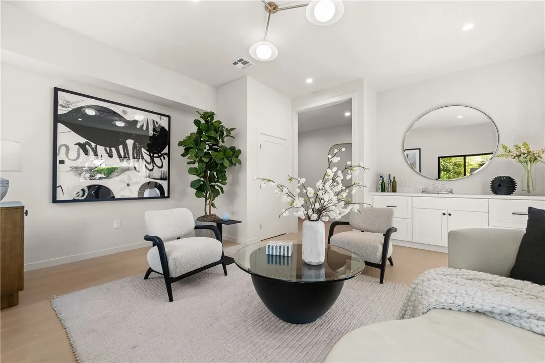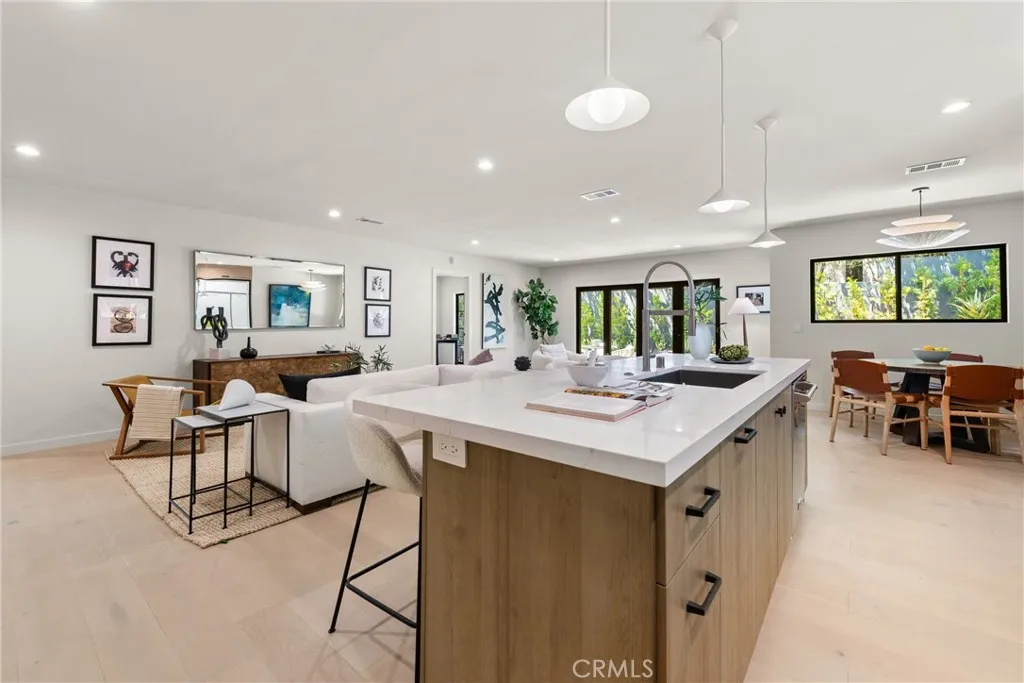 Hidden on a quiet tree-lined street in Mar Vista Hill, this home has been fully ground-up renovated with exceptional attention to detail, almost like a new construction. Crafted with high-quality finishes, it features quartz countertops, white oak wood cabinetry, and modern design elements throughout. The spacious layout includes a living room that opens seamlessly to the formal dining area, and a modern open-concept kitchen with a breakfast nook that overlooks the large family room with sliding doors to the backyard. The home offers four spacious bedrooms and a versatile den with a cozy fireplace, ideal for relaxing or entertaining. Step outside to a perfect private green backyard, ideal for outdoor living and gatherings. The main level also hosts two bathrooms. Upstairs, you'll find a luxurious primary suiteprivate and tranquil, equipped with a full bathroom and a rooftop deck. The location offers a true suburban feel while providing convenient access to Santa Monica and the rest of LA.