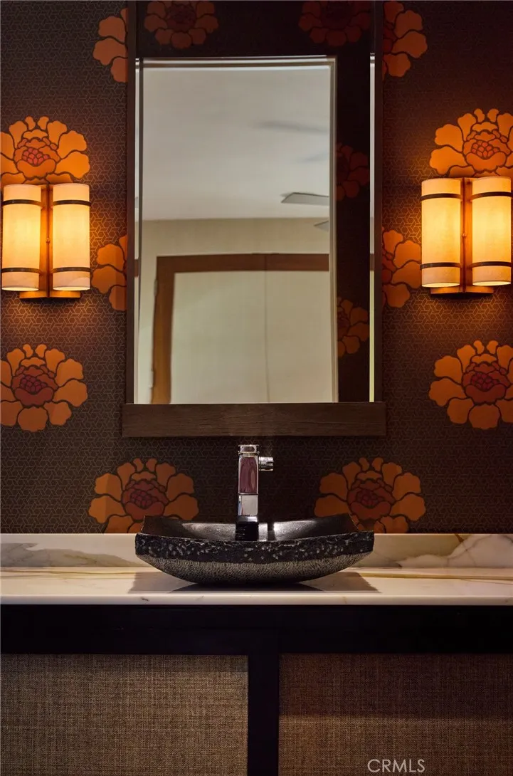 An exceptional representation of refined architecture, design integrity, and thoughtful accommodations developed to suit even the most discerning resident. Formally awarded the recognition of Best Architectural Design in Orange County, the residence was imagined and expanded by Louis Dennis and Jeff Dahl. With Frank Lloyd Wright and Mid-Century-inspired construction practices and design sensibilities, along with the direction of a Feng Shui Master, the creators crafted a one-of-a-kind collection of spaces with an enduring aesthetic; a meticulously sourced assemblage of resilient and rare elements; and a balanced, harmonious environment. The configuration of the entire 10,000 square-foot property, a fluid continuum of well-scaled spaces, is emblematic of the quintessential modern domain, affording myriad opportunities to comfortably reside, entertain, work, and enjoy an atmosphere of relaxed elegance. The interior encompasses six bedrooms; seven total baths; a library/office; formal living and dining or billiard room; a Poliform system kitchen; bar and media room; a fully-equipped fitness room with floor-to-ceiling roll-up doors; sauna; a temperature-controlled wine room; and six-vehicle gallery garage with its own lounge. The exterior surround is graciously connected through a series of massive custom-clad La Cantina collapsing glass doors an entry fireside terrace; central courtyard with a reflecting pool/spa; a secluded lush lawn, a water wall and sparkling swimming pool with a Baja shelf, adjacent to an outdoor kitchen and dining area equipped with a Teppan table and Ly