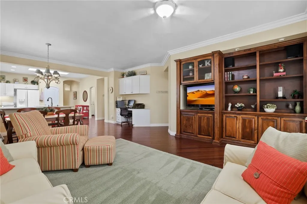 Single-Level Living in Trilogy 55+ | Corona This beautifully maintained 2-bedroom + den, 2-bath home offers a thoughtfully designed single-level layout in the sought-after gated community of Trilogy at Glen Ivy. Rich hardwood floors extend through the main living areas, setting a warm and elegant tone. At the center of the home, the bright kitchen features white cabinetry, recessed lighting, and a generous center island. The kitchen flows effortlessly into the great rooman ideal space for both entertaining and everyday living with custom media built-ins and plantation shutters that invite abundant natural light in, while a single elegant door opens to a private backyard with a manicured lawn and a covered patio. The two rooms are versatile and invitingone with a Murphy bed and shutters for flexible use, and the guest bedroom located at the front of the home with its own en-suite bath, mirrored closet doors, and plush carpet. The primary suite offers a private sitting nookperfect as a reading space or officealong with a walk-in closet fitted with built-in cabinetry and an en-suite bathroom with dual sinks and a walk-in shower. Life at Trilogy offers far more than a homeits an active, resort-style community. Residents enjoy indoor and outdoor pools, tennis, pickleball, bocce ball, a state-of-the-art fitness center with indoor lap pool and jogging track, plus endless opportunities for social connection, from live entertainment at the Grand Pacific Crest Lodge to art studios, billiards, and more. Nestled against dramatic mountain and canyon views, youre also just minutes from G