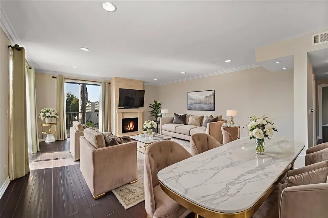 Just the perfect Beverly Hills Top Floor Corner Condo, walking distance from Rodeo Dr. An exceptional offering: 2 bedrooms, 2 full baths, and 1,640 SF of living space, highlighted by a wraparound corner balcony and private in-unit laundry. Views of Downtown from your balcony, kitchen and dining space. More Views of Century City sky rises and palm trees from your West and South facing balcony. Lavish double door entry into the unit where youll be covered in light shining through the wall of West facing windows. The most gorgeous morning sunrises over coffee or breakfast in your Viking-equipped kitchen, framed with rich wood cabinetry. With lofty ceilings in every room, this residence stands apart as the crown jewel of the building. Master bedroom has enough space for a California King bed, additional seating space, office desk, and more. Huge walk in closet with built ins and the sizable en-suite bathroom includes a double vanity and a hot tub. The guest bedroom has an advantageous size and a closet with a built in organizer. Second bathroom also features a large soaking tub. Very low HOA for the area under $400/month. Located within the prestigious Beverly Hills School District right in between Beverly Vista Middle School and Horace Mann Elementary, moments from Rodeo Drive, upscale dining, shopping, and renowned art and entertainment venues.