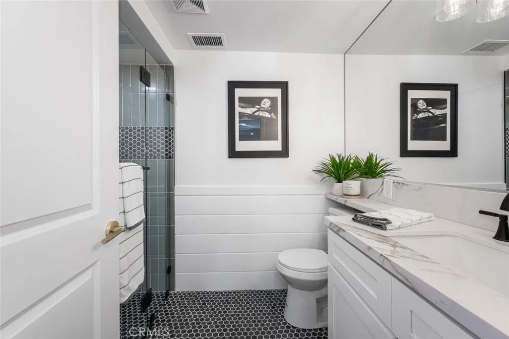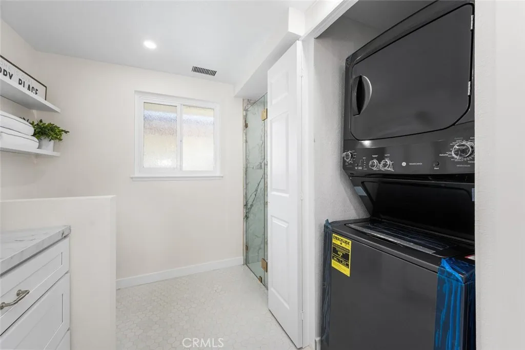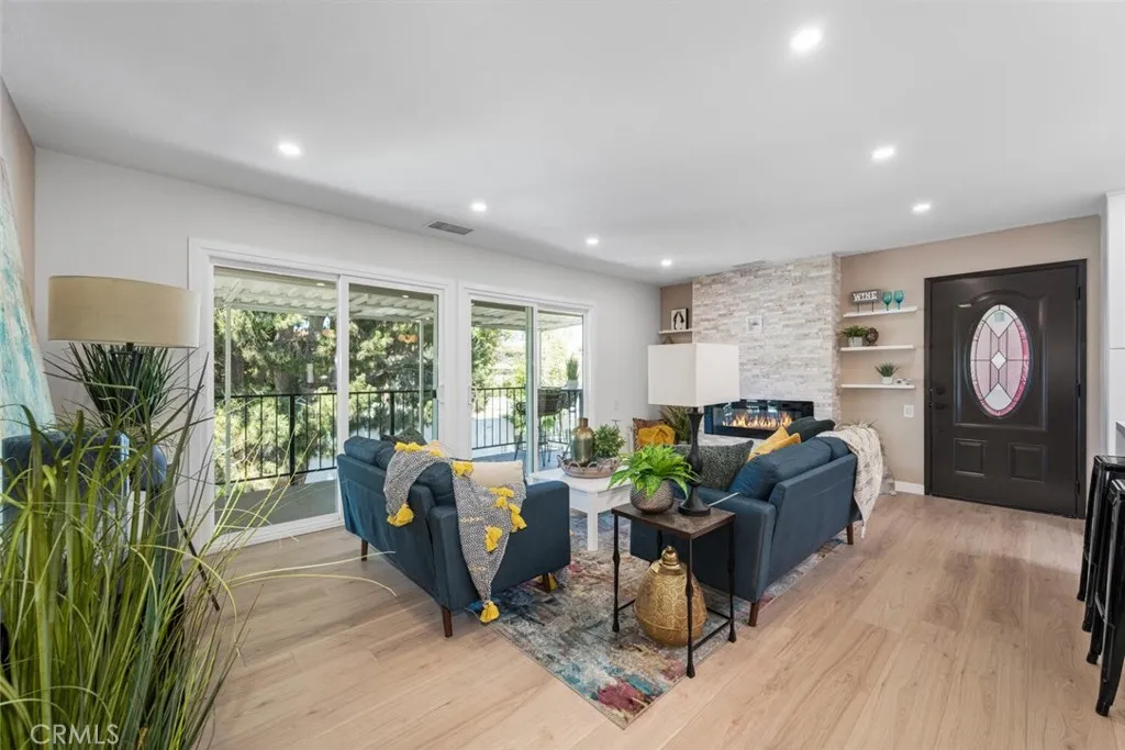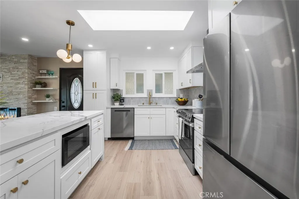 Welcome to this beautifully reimagined top-floor Casa Contenta model home, located in the desirable Third Mutual of Laguna Woods! Step inside to discover a stunning open-concept living space featuring recessed lighting and a custom floor-to-ceiling stone electric fireplace that serves as a striking focal point. Expansive dual-pane sliding doors bring the outdoors in, creating a serene, treehouse-like ambiance with an exceptional sense of privacyno neighbors in sight. Natural light floods the home through a dramatic skylight that spans the width of the kitchen. The kitchen itself is a true showstopper, thoughtfully updated with sleek quartz countertops, stainless steel appliances, Shaker-style cabinetry, pendant lighting, and an oversized island with a breakfast barperfect for entertaining. Adjacent to the kitchen is a dedicated dining area accented by stylish custom lighting fixtures, ideal for hosting dinner parties or casual meals. Down the hallway, you'll find a beautifully updated guest bathroom featuring a new vanity, a fully tiled roll-in shower, and a glass enclosure. The unique floor plan includes a private primary suite, complete with a luminous white bathroom boasting quartz counters, a tiled floor, and a low-threshold glass-enclosed shower. Additional highlights include high-quality laminate flooring throughout, central air conditioning, and an in-unit washer and dryer for your convenience.This home is ideally situated within Laguna Woods, allowing residents to take full advantage of its amenities. Laguna Woods Village residents are privileged to enjoy a 27-hole