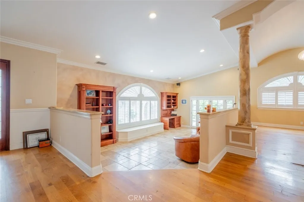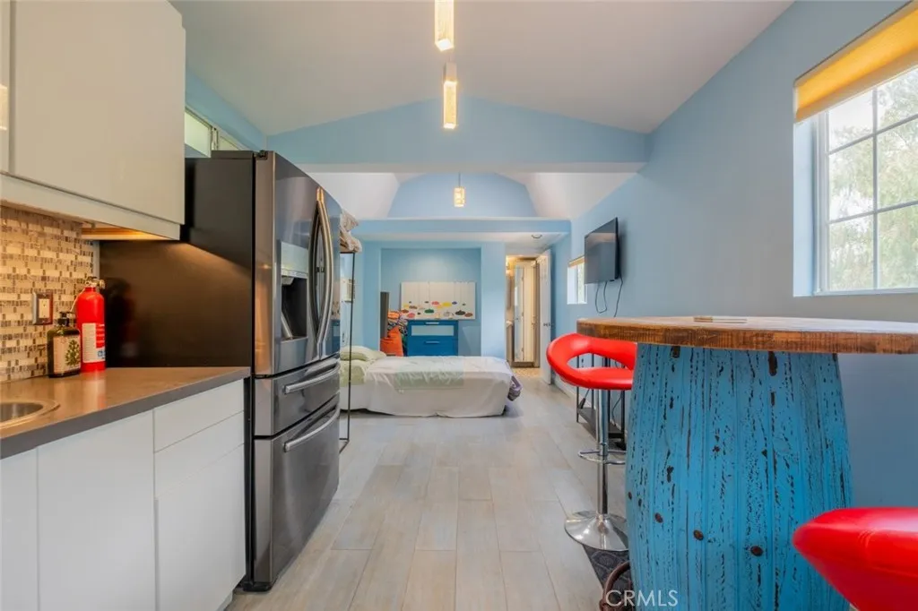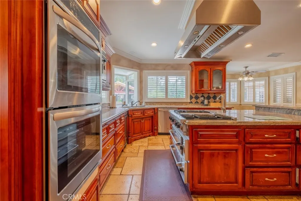 Experience luxury and tranquility with this extraordinary Simi Valley estate. Set on a 43,560 sqft lot, this 4-bedroom, 4.5-bathroom home offers 4,450 sqft of living space, seamlessly blending elegance and modern comfort. Built in 2006, the main house features a grand entryway, spacious living areas, and a chefs kitchen with a Sub-Zero fridge, double oven, garbage compactor, dishwasher (updated in 2018), and a bay window overlooking the heated saltwater pebble pool and spa, remodeled in 2017. A breakfast nook with additional bay windows offers serene views. The primary suite boasts a cathedral ceiling, spa-like bathroom with soaking tub, double vanities, walk-in shower, and double-sided fireplace, along with an oversized walk-in closet. Ballroom-style flooring, a waterfall chandelier, and French doors leading to the pool complete the living area. Window shutters and high-speed internet with Eero extenders enhance functionality. Additional living spaces include a remodeled in-law suite with two bedrooms, two bathrooms, a full kitchen, and laundry, a 2017 guesthouse with a kitchenette and stylish bathroom, and a detached office/game room with an electric fireplace and heater. The three-level backyard is an entertainers dream with a heated saltwater pool, spa, a pond, a covered patio with built-in BBQ, and a Japanese Teppan grill. A stargazing terrace, picnic area, firepit, and water features add charm, while mature fruit trees provide natural beauty. The remodeled three-car garage offers pebble flooring, an EV charging port, and fridge and freezer, while gated RV parking incl