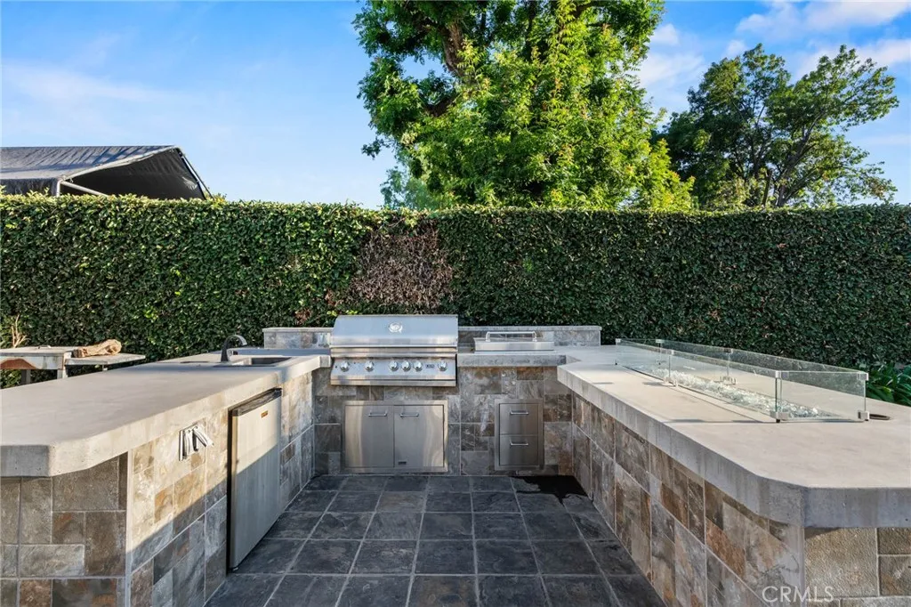 This stunningly reimagined private estate on nearly half an acre in Woodland Hills prestigious College Acres is a true dream home, offering permitted 5,000 sq. ft. of luxurious living space. Fully gated and secure, the residence captures todays demand for the ultimate open-concept lifestyle. Highlights include 6 bedrooms, 6 baths, a home office with private entrance, Italian porcelain floors, and a projection-ready home theater/family room with soaring 14-ft vaulted ceilings and walls of windows. An art-gallery-style living room with baby grand piano, formal dining area, and an expansive family room make this home perfect for entertaining. Step outside to a Caribbean-blue Baja ledge pool and spa, landscaped flowering grounds, and dramatic smart lighting. Additional features include rare 360 ft of utility storage, plus inside and outside kitchens for effortless entertaining. The chefs kitchen is designed for gatherings, with a jumbo-size conversation island, integrated appliances, 22 ft quartz counters, sleek European cabinetry with pull-out drawers, stainless steel Viking commercial ovens and range, Sub-Zero refrigerator, oversized sinks, vegetable prep sink, and a large walk-in pantry. Outdoors, host in style at the custom kitchen with grill and 4-ft wall of fire centerpiece dining bar. Retreat to the junior master suites in separate wings, each with private bath and state-of-the-art shower. The luxury primary suite features a fireplace, spa-inspired marble bath with six-jet tub and steam shower, and a spacious walk-in closet. A true resort-style estate blending elegance,