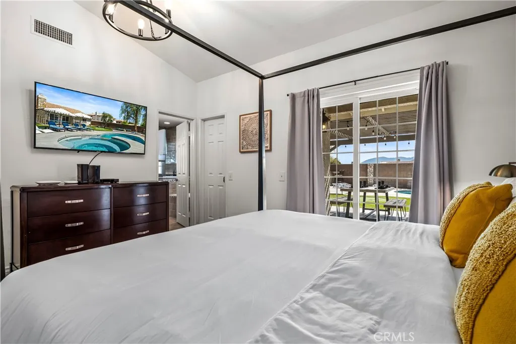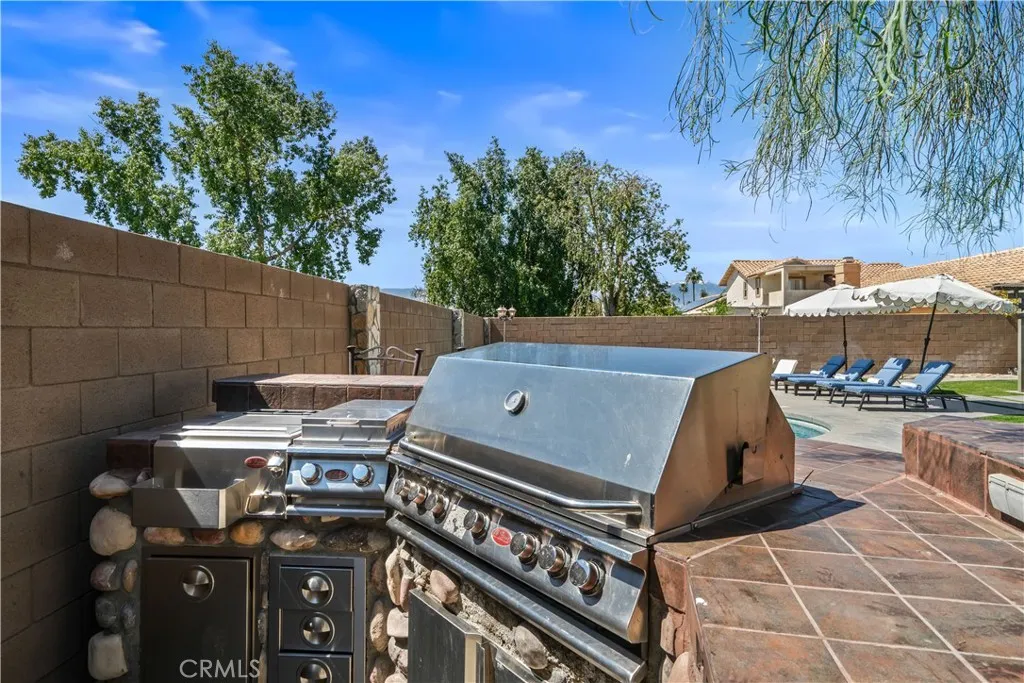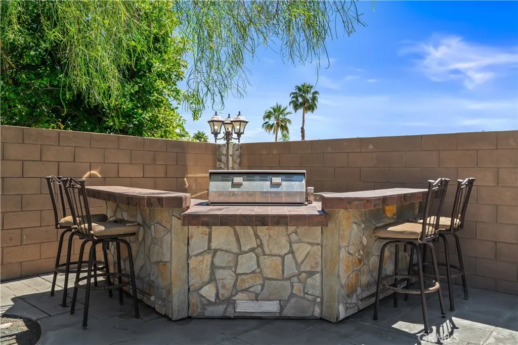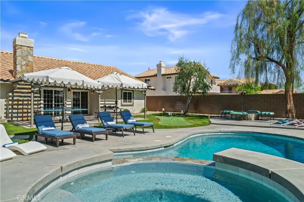 Discover this charming slice of paradise in North La Quinta. This beautiful, Spanish style home is full of character, thoughtfully updated finishes and comes fully furnished! As you enter through the front gate, and the manicured front yard. Feel the tranquil setting, the attention to details and design that set's this home apart. This home features 4 spacious bedrooms, 2 bathrooms with intricate tiling and beautiful updates throughout. The primary bath features a built in large soaking tub, custom vanities and separate walk in shower. A gorgeous large kitchen with granite slab countertops, stainless steel appliances and a perfect layout to host friends and family. With a well suited floor plan and vinyl plank wood flooring throughout to create a comfortable and inviting atmosphere. Equipped with a 2 car garage and an amazing, fully permitted home theater with a projector and reclining seats. Entering the oversized rear yard, features a gorgeous salt water pool and spa, a built-in BBQ with bar seating, putting green and a custom fire pit! (Notice, this is one of the few homes in LQ highlands with a rear block wall!) both manicured front and backyard landscape perfect for outdoor entertaining. Centrally located to world renowned festivals like Coachella, Stagecoach, Indian Wells tennis tournament and the new Acrisure Arena. Not to mention, attractions like Disney Cotino, Palm Springs and many more that drive year round demand, don't miss this opportunity in La Quinta."