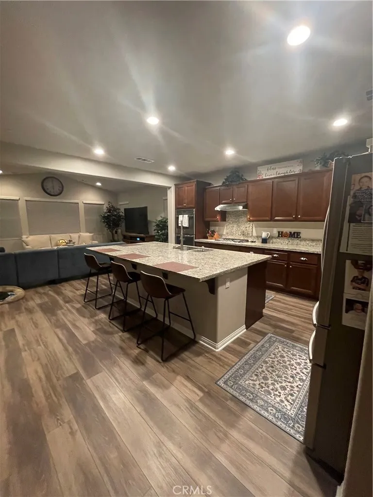 A must-see home is situated in Menifee, California, one of the fastest-growing cities in the region. Nestled near the renowned wine country and Old Town Temecula, this home stands as a testament to pride of ownership. The home boasts an exquisite gourmet kitchen, seamlessly integrated with an open family room, formal dining area, coffee bar, and a bonus room that doubles as an office. Additionally, a downstairs suite provides comfort for the mother-in-law, complete with a full restroom, walk-in closet, mini refrigerator and microwave in cabinets. The upper level features a spacious media room, two generously sized bedrooms, and a master bedroom. The laundry room is conveniently located and includes a sink. The homes exterior is beautifully landscaped, encompassing both the front and back yards.