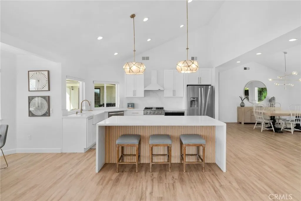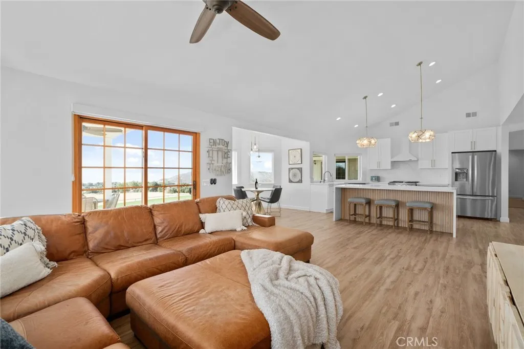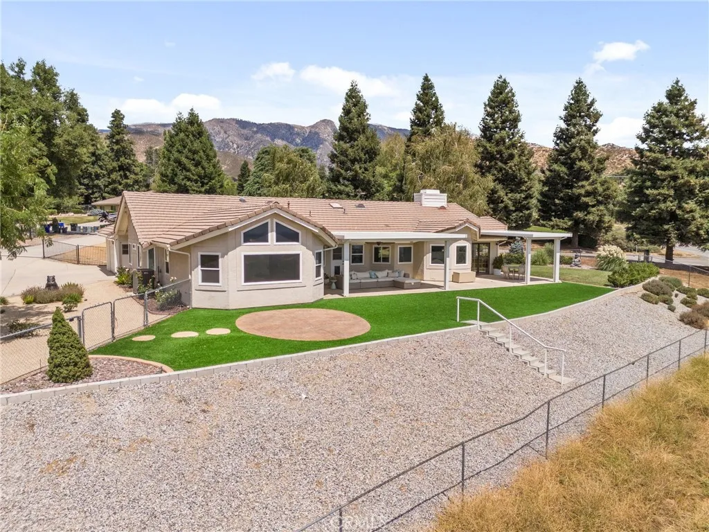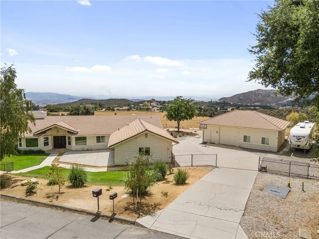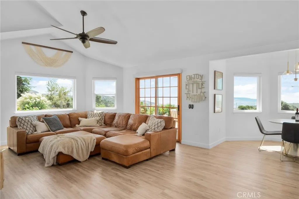 Elevated living inside and out! Serenity IS this single level home perched at the top of Yucaipa on the crest of Oak Glen apple country! You must EXPERIENCE Oak Crest in person to appreciate its magic! To feel the warm sun beams flooding the home with natural light throughout. To hear the hum of nature and only nature as you soak in VIEWS of Magnificent Sunsets transcending to Magical Evening City Lights. What you won't hear is your partner tinkering on their muscle car because in addition to your 3 car attached garage, lies their very own 1200 square foot detached garage separate from your gorgeous peaceful home! TWO GARAGES can you believe it?! Everyone will love this 4 bedroom 3 Bath, open-concept layout offering soaring ceilings and expansive windows with two living areas and modern fireplace. Custom blinds, electric sliders, ceiling fans, recessed lighting, new luxury vinyl flooring, windows, cabinetry, and fixtures create a move-in ready experience. The chefs kitchen features striking quartz countertops with waterfall island, soft-close cabinets, a farmhouse sink, and upgraded appliances. The executive suite is a true retreat, with panoramic windows framing unforgettable sunsets. Its spa-like bathroom showcases elegant tilework, a soaking tub, walk-in shower, dual vanities, and a spacious walk-in closet. Three additional bedrooms feature fresh carpet, generous closets, and ceiling fans. Enjoy Two additional upgraded bathrooms inside as well as laundry room with built-ins, farmhouse sink, and backyard access add style and practicality. Step outside to your backyard oas