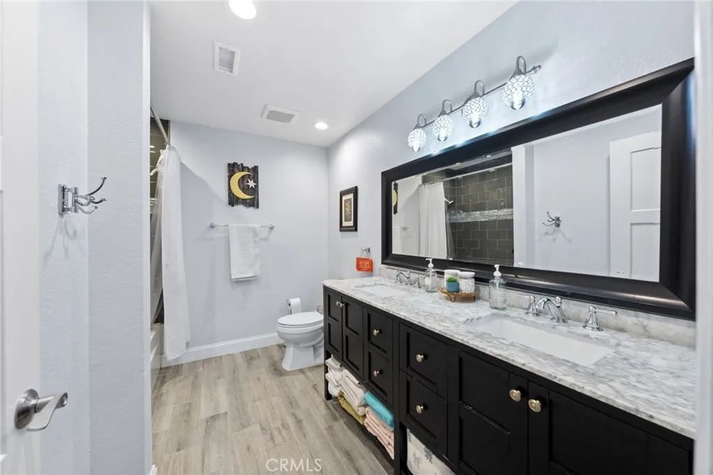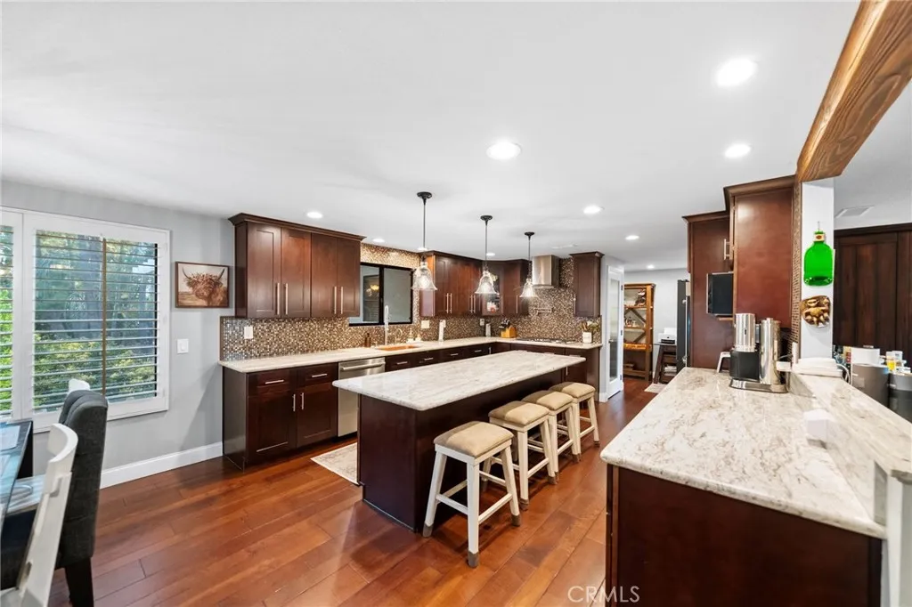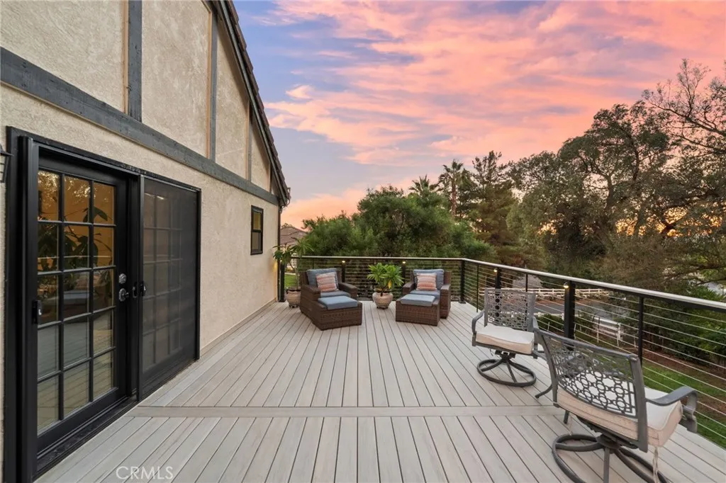 Welcome to Meadowview, one of Temeculas most desirable neighborhoods! Ideally located in the heart of townjust minutes from top schools, the Promenade Mall, wineries, and restaurantsthis home offers convenience while feeling like a world away. This beautifully updated home features 4 bedrooms, 3.5 baths, and 2,875 sq. ft. on a .53-acre usable corner lot. Upgrades include PAID solar, smart home features, a remodeled primary suite, a new upstairs HVAC system, and an incredible new outdoor living space. The upstairs waterproof deckwith sleek cable railingexpands your living area below, sitting above the covered patio equipped with fans, lights, an outdoor TV and soundbar and electric screens, making it perfect for year-round enjoyment. Inside, the gourmet kitchen opens to the living, dining, and family rooms and boasts a large granite island, abundant counter and cabinet space, pot filler, and stainless steel appliances including a 5-burner gas cooktop with hood, double ovens, microwave, dishwasher, and a new smart refrigerator. The large sunken family room is the heart of the home, complete with charming stone, wood burning fireplace and French doors that lead to the outdoor living area perfect for relaxing or entertaining. Upstairs, the primary suite has been fully remodeled with a large tub, chandelier, separate shower and fitted walk-in closet. It is joined by two additional bedrooms, both with fitted closets and new glass doors. There is an additional full bath to complete the upstairs. Downstairs, a private bedroom suite with French doors to the backyard provides the pe