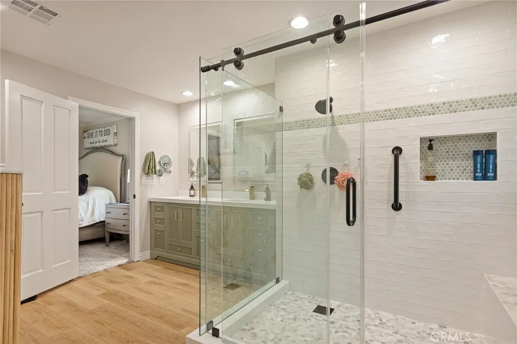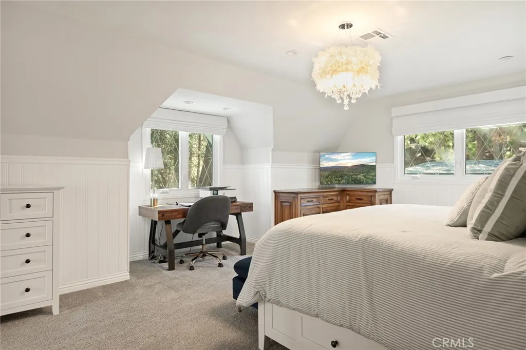 Where Mountain Magic Meets Modern Luxury Welcome to an enchanting retreat tucked within the prestigious Lake Arrowhead Country Club, gracefully perched on the signature 16th tee box. Here, luxury living is kissed by the whisper of towering pines, the sparkle of mountain air, and the timeless allure of Lake Arrowheadwhere your lake rights invite you to endless days of adventure on shimmering waters. Originally reimagined in 2021 and remodeled again in 2025, this residence has been elevated with a collection of exquisite upgrades. Inside, new wood flooring flows throughout the home, while the master suite was transformed with plush new carpet, an enlarged walk-in closet, and a fully remodeled bedroom retreat. The kitchen shines with custom-painted cabinets, custom wainscoting, a gleaming new quartzite island countertop, and dazzling designer chandeliers in both the living and dining rooms. Fresh interior and exterior paint, along with striking new iron-and-glass entry doors, lend the home a crisp and refined elegance. In the living room and master suite, newly crafted stone fireplaces create warm, inviting focal points, and a whole-home water filtration system enhances everyday living with mountain-pure freshness. The main level embraces open-concept living, seamlessly blending living and entertaining spaces. At its heart is a chefs dream kitchen featuring GE Caf appliances and a magnificent Italian ILVE six-burner range. Three distinct gathering areasincluding the celebrated Presidential Billiards Room and Cocktail Loungeoffer versatile settings for everything from cozy fire