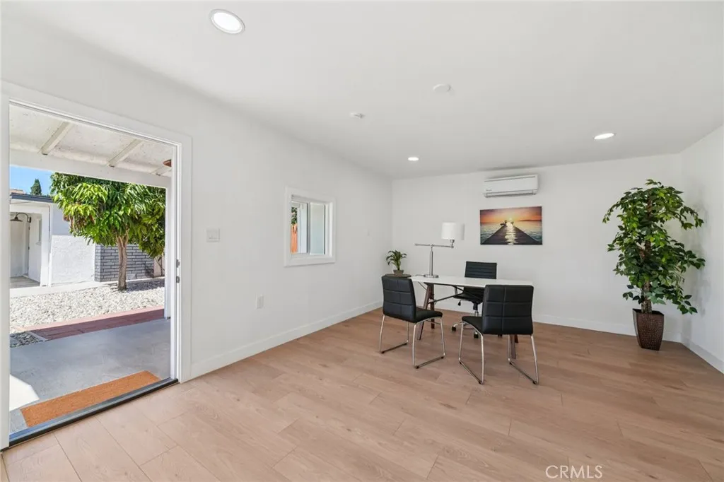 Beautifully Updated Home with a Detached Bonus Room in Prime Santa Ana. Welcome to this beautifully renovated single-story home that blends modern style with thoughtful, high-quality upgrades throughout. This 3-bedroom, 2-bathroom residence features an open-concept kitchen with quartz countertops, custom backsplash, and stainless steel appliances, complemented by dual-pane windows, waterproof laminate flooring, recessed lighting, and matte black fixtures. Both bathrooms are completely refreshed, with no detail overlooked, combining style and functionality. Major system upgrades provide peace of mind, including a brand-new roof, 200-amp electrical panel, central HVAC with new ducting, and a new gas line. Outdoor living is enhanced with a new covered patio, front and back concrete pavers, fresh landscaping with automated sprinklers, and new fencing on both sides of the property for added privacy. The finished garage includes drywall, epoxy flooring, a new garage door, and automatic opener. A detached bonus room with new siding, windows, roof, concrete, and a mini-split system provides versatile space for a home office, gym, or studio. Located near Riverview Golf Course and Santa Ana College, with quick access to local shops, restaurants, and more.