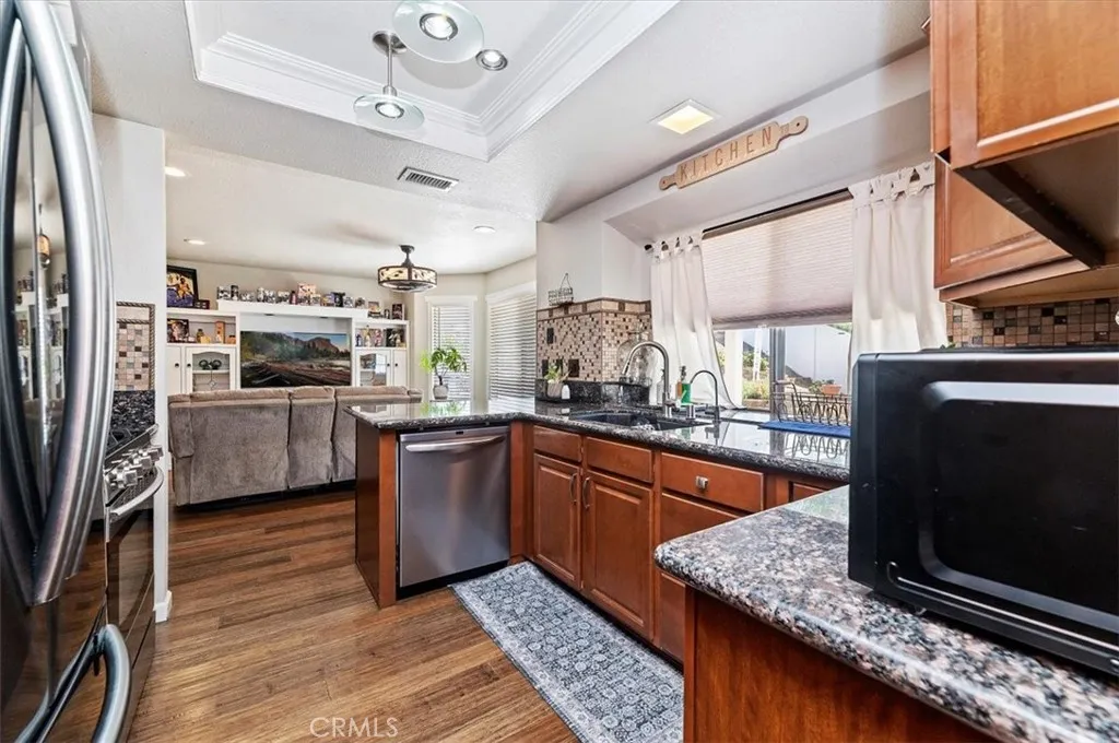 Welcome to your new home! Stunning 4-Bed, 3-Bath, 2-Story Home in Sunnymead Ranch! This beautifully upgraded home features 4 large bedrooms and 3 full baths. With one bedroom and one bathroom on the first floor. The home also has bamboo wood flooring, a custom wrought-iron staircase, a cozy fireplace, an upgraded kitchen and french doors. The updated kitchen offers granite countertops, stainless steel appliances, custom lighting, and a large bay window. Spacious bedrooms include oversized closets, and the luxurious primary suite has a private balcony, dual sinks, and a walk-in closet. Enjoy the beautifully lighted backyard with a fire pit and paved side area. Freshly painted, newly recovered roof, and a 3-car garage with 220V outlet & storage loft. Located in the sought-after Sunnymead Ranch community in Moreno Valley, featuring walking paths, lake, clubhouse, gym, pool, spa, tennis, pickleball, and more!