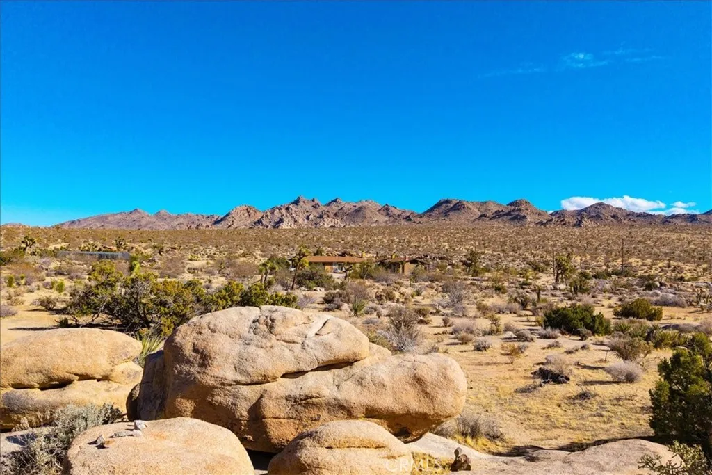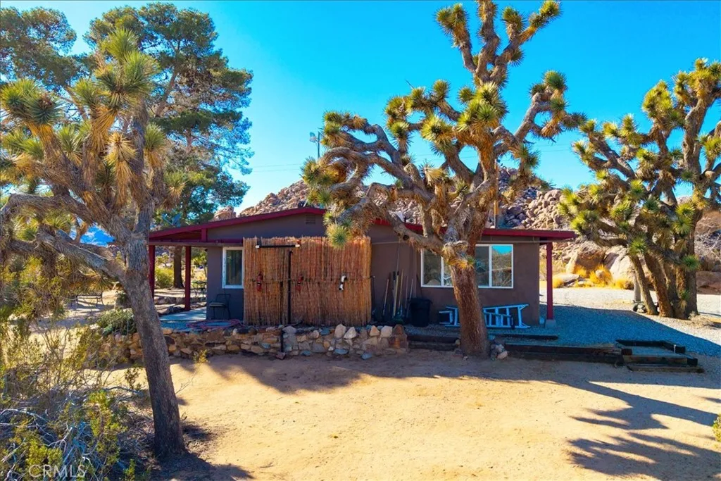 Nestled in the secluded Northeast corner of Monument Manor, this serene desert retreat offers a unique blend of natural beauty and modern comfort. From this idyllic desert escape, take in breathtaking views of Joshua Tree National Park, or hike directly into the park. By day, relax on your front porch, feeling the gentle desert breeze and enjoying its sound in the pines. Delight in spectacular sunsets and star filled nights, enveloped by peace and quiet. This cozy 3-bedroom, 2-bath home is tucked away amid giant boulders, huge ancient Joshua trees, and the shade of tall pines. The property invites you to experience the wonders of desert wildlife, including hawks, owls, tortoises, bobcats, and coyotes. An art studio, with a magnificent view of the park, and next to an enormous boulder, offers endless inspiration for creativity. Adding to its charm, the property includes a classic, 1954 ABC Park Model trailer in good condition with power and water, ready for a facelift to unlock its full potential. (Tax Records show 680 sq ft , 1bd 1bath) Enjoy the comfort of paid solar, mini splits, and a beautifully maintained working fireplace. This home is a true desert oasis where you can immerse yourself in the serenity of nature. Dont miss the opportunity to make this one-of-a-kind property your own! Please include a recent pre-approval letter and proof of funds with your offer. Buyer to verify all MLS information, including but not limited to: permits and uses, bed/bath counts, square footage, school information and enrollment availability. Buyer is advised to independently investigat