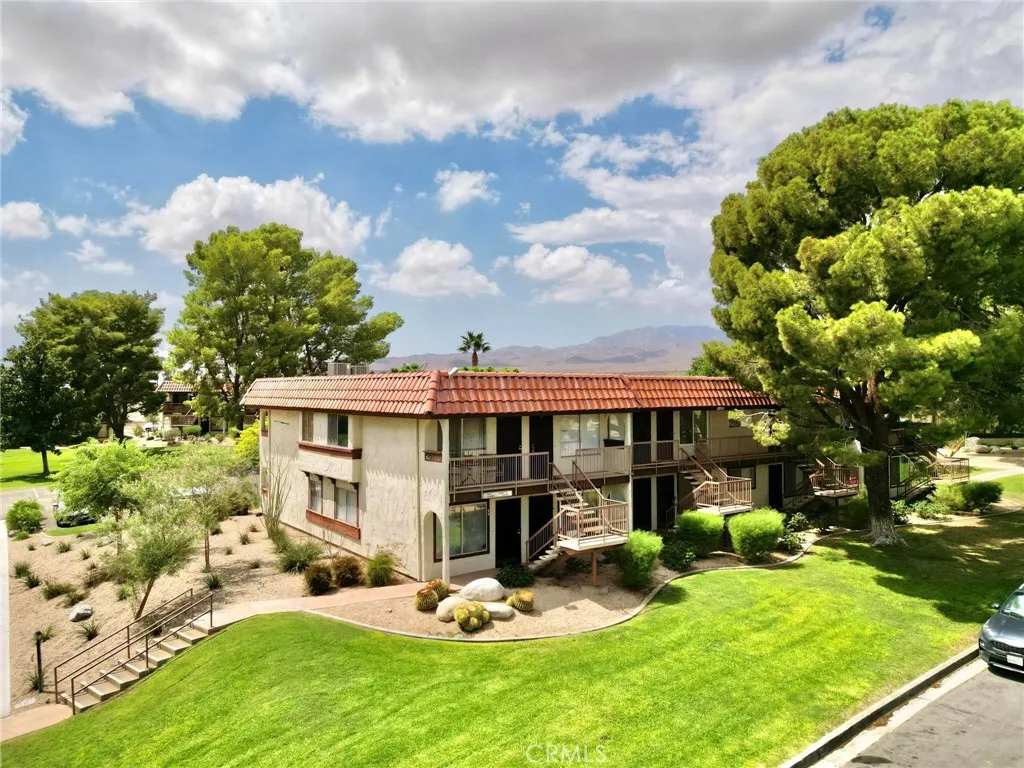 Welcome to your charming one-bedroom, one-bathroom retreat in the heart of Desert Hot Springs. Nestled within a tranquil country club community, this second story condo offers comfort, style, and convenience with sweeping golf course views and resort-inspired amenities. Inside, youll find a light-filled living space with fresh paint and modern laminate flooring that create a warm, inviting atmosphere. The open dining area is ideal for morning coffee or intimate meals, while the thoughtfully designed kitchen features crisp white appliances, sleek quartz countertops, and plenty of room for preparing your favorite dishes. The spacious bedroom provides a peaceful escape, perfect for both relaxation and everyday living. The bathroom boasts a walk-in shower, single-sink vanity, and tasteful finishes. Step outside to enjoy all the community has to offer, including a golf course, sparkling pool, clubhouse area, and fitness center. For added convenience, youll also have access to shared laundry facilities. Spend quiet mornings on your front porch with a good book, or simply take in the serene surroundings. Pets are welcome!
