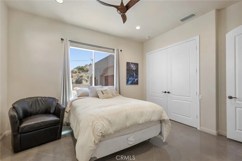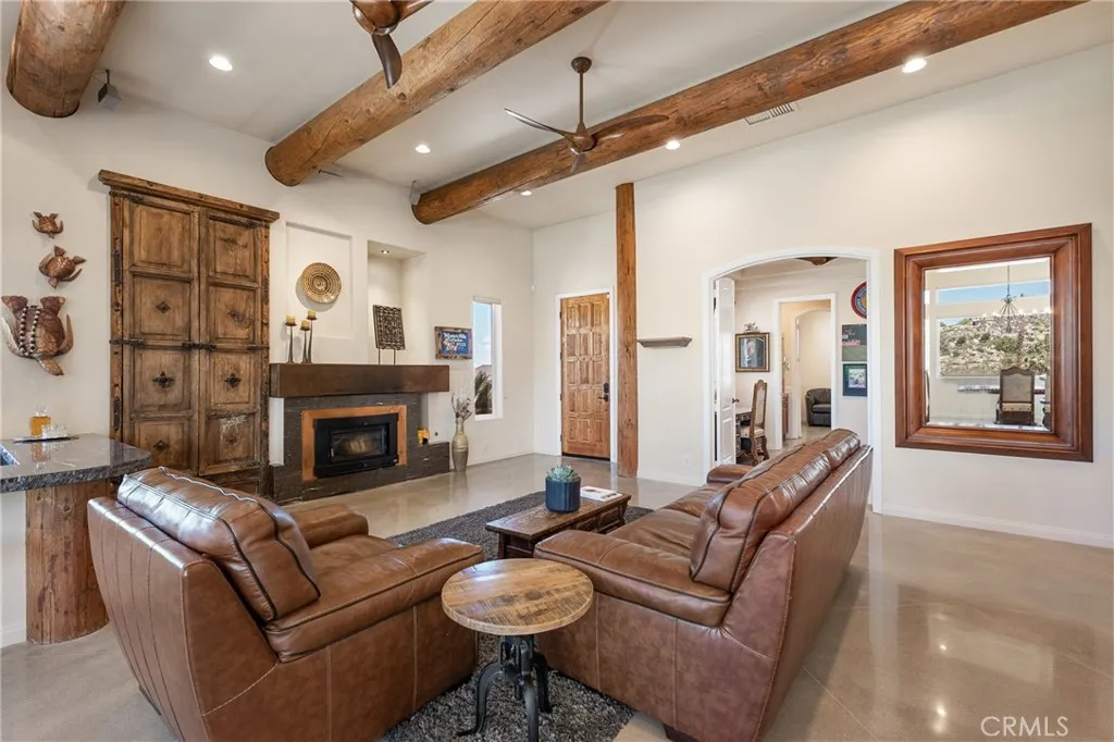 For the buyer who refuses to settle for anything less, welcome to this exceptional Yucca Valley estate. Perfectly positioned on a 1-acre corner lot with sweeping views, this custom-built home was thoughtfully built into the surrounding natural rock formations, blending modern design with the deserts raw beauty. Inside, youll find a master en suite, two additional master bedrooms, plus a versatile bonus bedroom/office. The home is filled with natural light thanks to expansive picture windows that frame the dramatic desert views. The high-end kitchen is a chefs dream, featuring matching KitchenAid appliances, a six-burner commercial gas cooktop, and a pot filler. No detail was overlooked: all-steel construction, zoned heated polished concrete floors, dual-zoned AC with electric heat, two wood-burning fireplaces, wood ceilings, a dedicated laundry area, motorized window coverings with blackout shades in the bedrooms, solar window tint, and built-in closet systems. The home also includes a paid-for, overbuilt solar system, whole house surge protection, and an AC/heated garage with industrial storage racks. A private sauna room offers spa-like relaxation, while the exterior impresses with landscape lighting, drip irrigation, mature trees, and a storage shed with a matching garage door. At night, the architectural lighting on the home and trees creates a breathtaking ambiance. The surrounding grounds are equally incredible, with thoughtful landscaping designed to complement the desert terrain and natural rock features. Outdoors, the property is designed for entertaining featuring