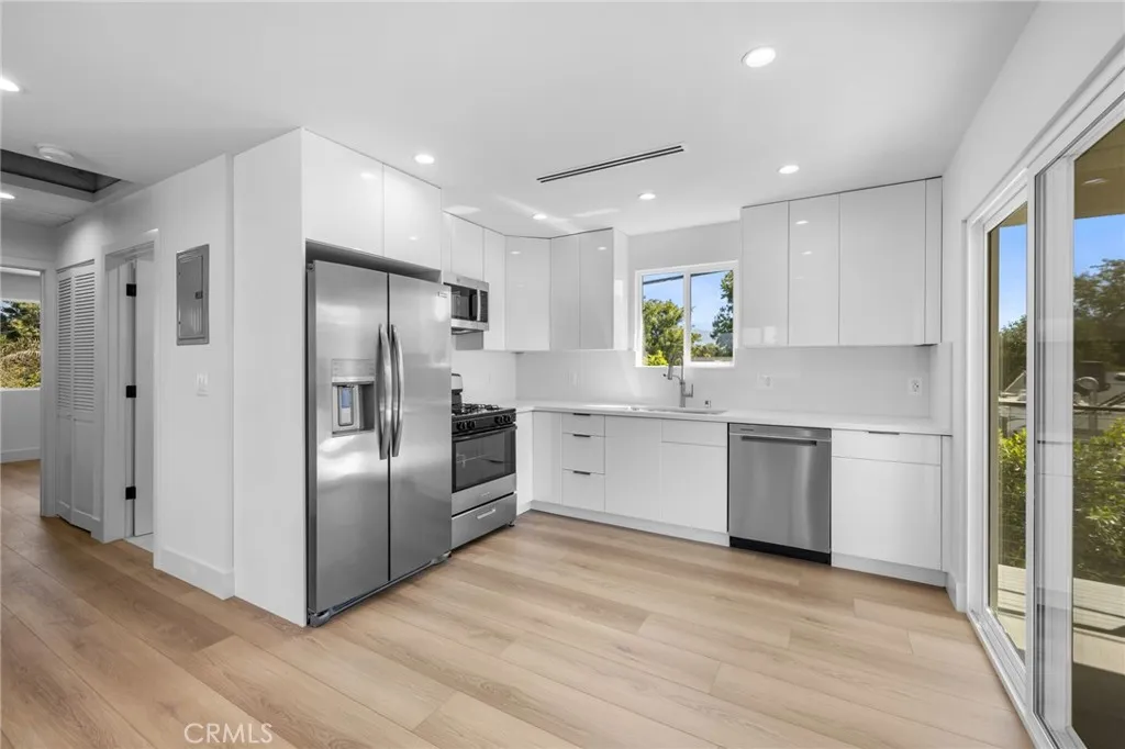 Price Improvement!! On a quiet street in Burbank, we are unveiling this brand new SB9 construction project, which makes a monumental leap forward in urban development. Designed with a blend of innovative architecture, sustainability and efficient use of space, this structure exemplifies the evolving needs of the community. Where traditional homes meets contemporary style, a once dated front house has been redesigned and paired with three newly constructed units. The redesigned front house with its charming front porch, features 3 bedrooms and 1 3/4 baths, an open living space with high ceilings and a custom kitchen with stainless steel appliances and an eating area on the quartz topped island. There is also a laundry closet with a stackable washer and dryer. The one bedroom unit features 10 ft ceilings and is attached to the back of the front house but has separate entrance. It features a full bath, a laundry closet, and custom kitchen cabinetry with quartz stone counters. The back two story structure consists of two new identical 2 bedroom, 1 bath units The ten foot ceilings are featured throughout with an abundance of kitchen cabinetry and quartz counters. The upstairs unit offers lots of natural light and some views as well as outdoor living with a generous sized balcony. The downstairs unit has a private patio which would be ideal for entertaining. These two units are newly built and therefore have completely paid for solar panels. All units feature tankless water heaters and there is a long driveway for cars. There is also an attached single car garage. This new develo