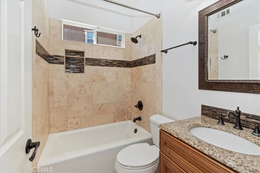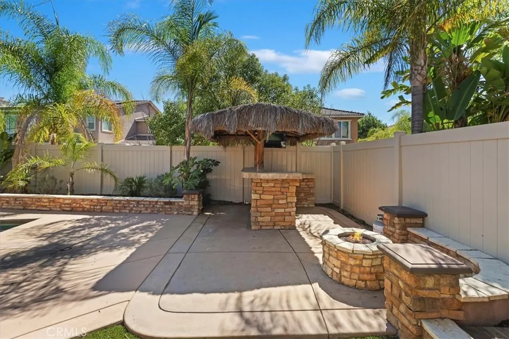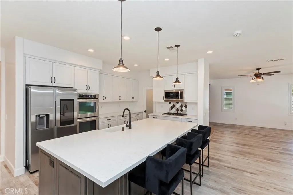 Beautiful, turnkey and upgraded pool home with paid off solar in Murrieta Oaks community offering over 3,200 sq. ft. of beautifully upgraded living space, offers 5 spacious bedrooms, including a convenient main-floor suite, and 3 full bathrooms. Inside, youll find soaring ceilings, plantation shutters, and elegant vinyl plank flooring throughout the open-concept layout. The gourmet kitchen boasts quartz countertops, double ovens, a large island with pendant lighting, and a walk-in pantry that flows seamlessly into the family room with a cozy fireplace and built-in entertainment center. Upstairs, a versatile loft leads to generously sized bedrooms, including the luxurious primary suite with dual vanities, a jetted tub, and a huge walk-in closet. Step outside to your private backyard oasis, complete with a sparkling LED-lit pool and spa, firepit, synthetic turf, and an Alumawood-covered patio with a built-in bar, recessed lighting, ceiling fan, perfect for entertaining year-round. Additional highlights include a 3-car garage with storage and workbench, a solar system, water softener, and no HOA!! Close to top-rated schools, shopping, dining, and freeway access, this home truly combines comfort, style, and convenience in one package. A must see!