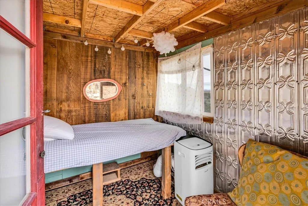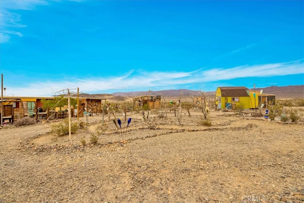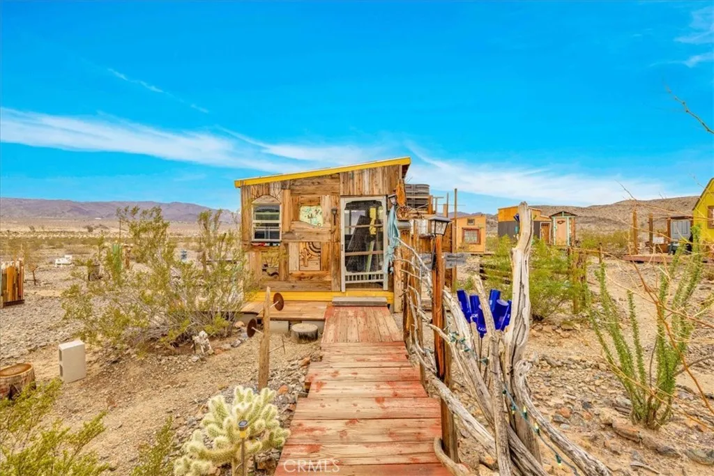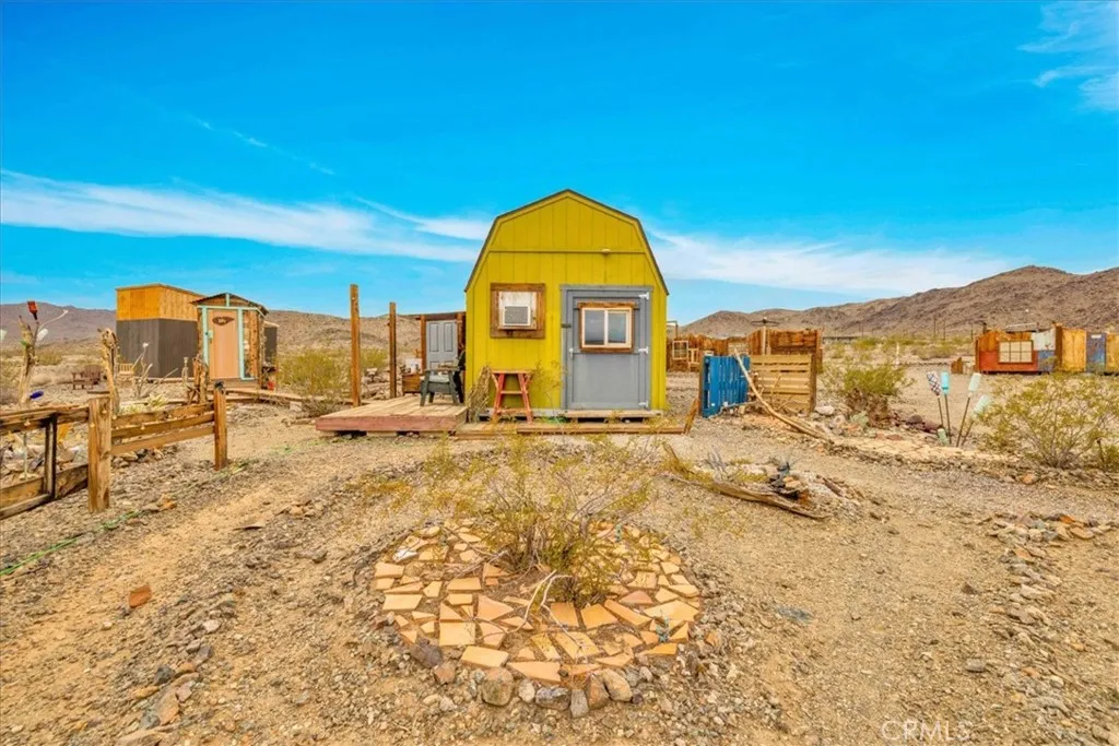 Incredible Opportunity to own a very UNIQUE & One-Of-A-Kind desert property just MINUTES from Joshua Tree National Park. This artistically revived 1958 homesteader is nicely situated on 2.5 acres of land with multiple multi-use outbuildings and stunning panoramic desert and mountain views. The main cabin adorns warm wood flooring, a brand new Mini-split, a lovely wood-burning fireplace and several large windows that let in an abundance of natural light. The quaint kitchen and dining area features a charming built-in dining nook, mounted shelving and hand-built cabinetry. The bathroom is anchored with a large clawfoot tub to soak the day away and the primary bedroom has a cozy cottage feel with a connected enclosed outdoor porch (the perfect spot to enjoy a morning cup of coffee). Outside you'll be delighted to find a covered dining area with a cob oven, a convenient laundry closet, a fenced-in lounge or pet area, a colorful performance stage, an outdoor shower & loo and a playful art pathway connecting all the varying art installations. These Site structures include two workshops, a 120 sqft guest cabin, two guest pods, a 1970 trailer named "LUCY" and plenty of additional space to entertain or simply relax around a firepit on a starry desert night. There are also RV hook-ups for the traveling guests! This charmingly eccentric compound would make for a great artist's retreat, a rental property or someone's serene sanctuary away from all the hustle & bustle. It's a less than 15 min drive to downtown Joshua Tree, downtown 29 Palms, eateries, vintage shopping & more but still f
