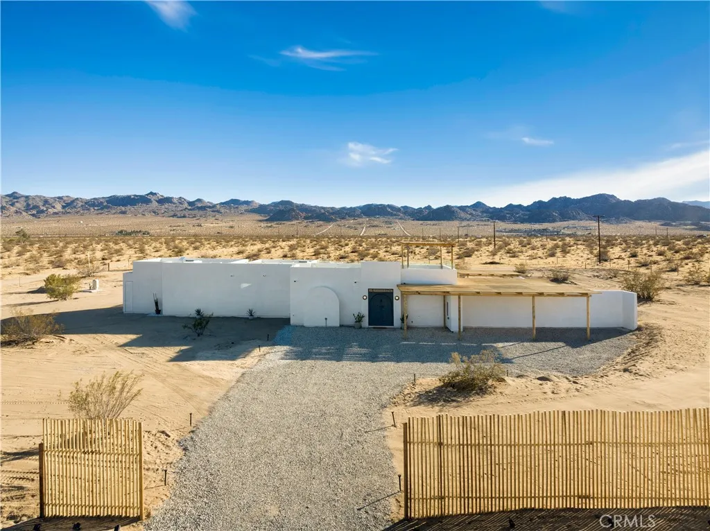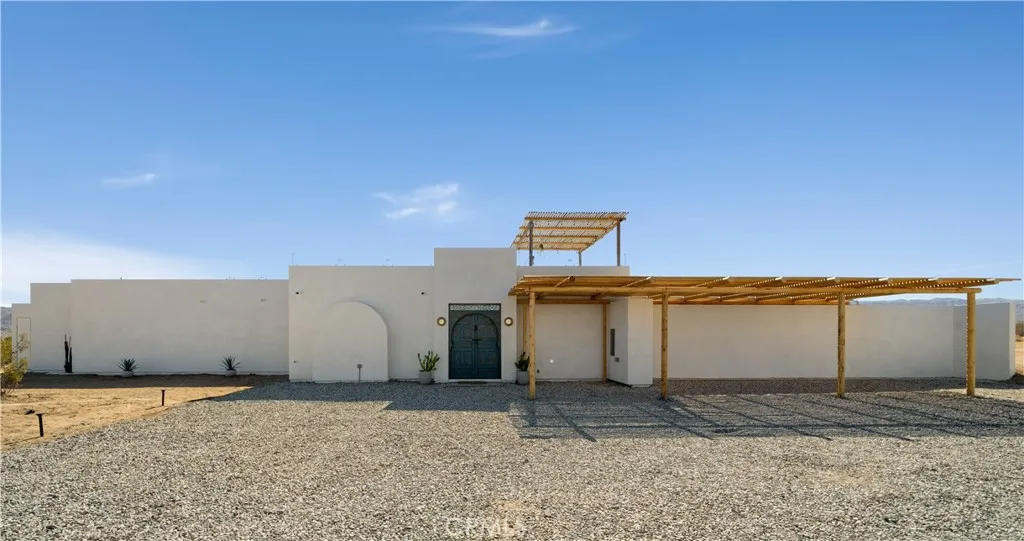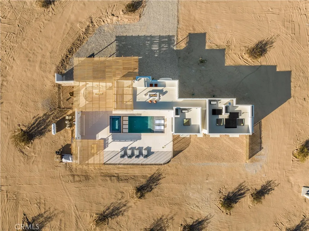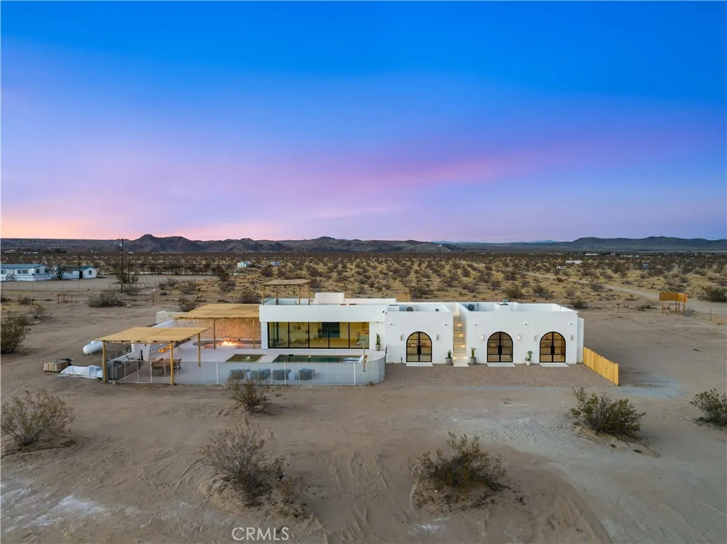 ATTENTION INVESTORS - High Income property ,Stunning Ibiza-Style Desert Oasis: A Once-in-a-Lifetime Opportunity Welcome to your dream home a unique 1,540 sq. ft. Ibiza-style residence nestled in the breathtaking desert landscape. This fully custom property offers an unparalleled living experience, perfectly designed for both relaxation and entertainment. Upon entering this exquisite home, you will be greeted by an impressive 30-foot pocket door that seamlessly merges indoor and outdoor living, allowing you to fully appreciate the natural beauty of the surrounding 2.18 acres, complete with stunning views of the Joshua Tree Monument. The design promotes an effortless flow throughout the space, making it ideal for gatherings or tranquil evenings. Step outside to discover over 700 sq. ft. of rooftop space, featuring a stylish pergola that provides 360-degree views of the desert landscapean ideal backdrop for sunset cocktails or stargazing. The expansive outdoor deck boasts a sunken seating area capable of accommodating over 20 guests, making it an entertainer's paradise. This home is meticulously crafted with imported custom furniture and finishes, showcasing the finest materials. Each corner of this residence radiates charm and sophistication. Culinary enthusiasts will appreciate the full BBQ kitchen, perfect for summer cookouts, while the sunken fire pit and additional rooftop fire pit create an inviting ambiance for evening gatherings under the stars. Adding to the allure of this property is a large pool complemented by an oversized jacuzzi, providing a luxurious retreat pe
