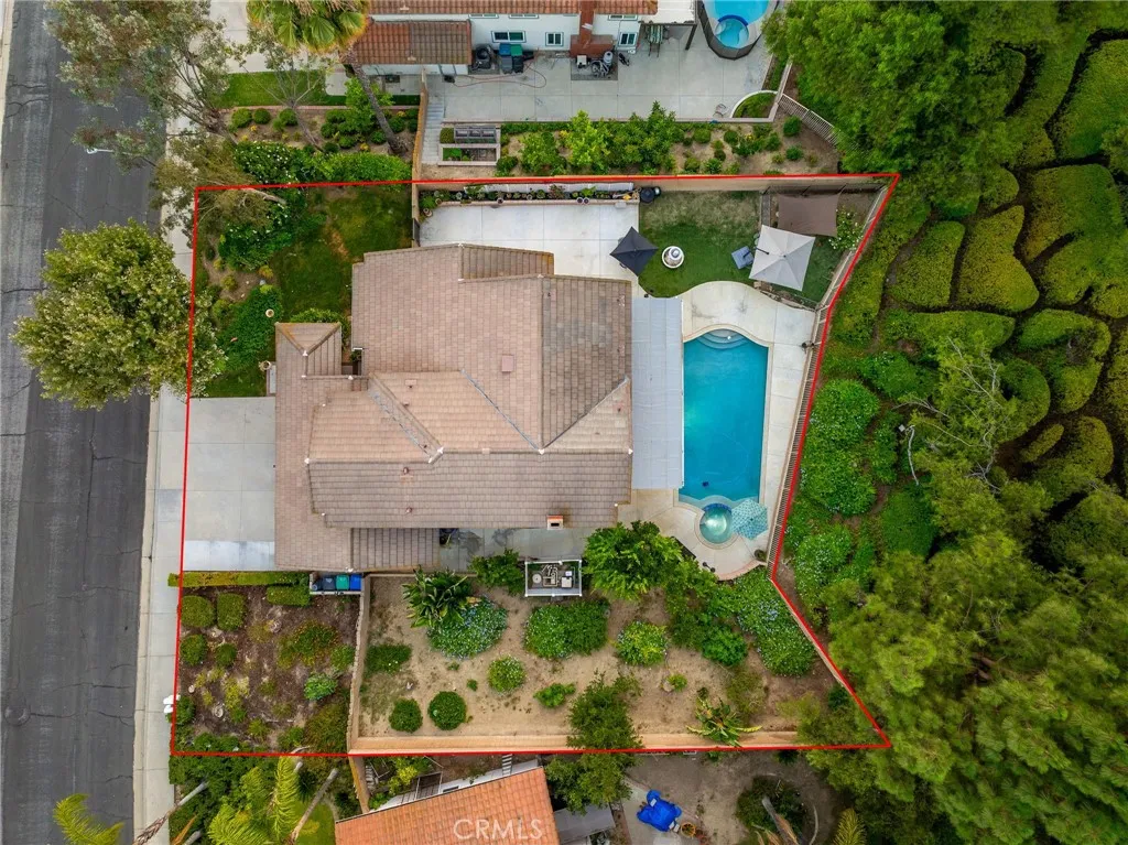 Completely remodeled and set on an elevated lot, this home showcases a beautiful pool and spa with a private backyard that opens to a manicured greenbelt. The front yard is nicely landscaped with mature trees, hedges, and a lush lawn. A brick-ribbon walkway leads to the elegant front door, opening to a marble entry and an open floor plan with soaring vaulted ceilings and a sweeping staircase. The living room features luxury vinyl plank flooring, a picture window overlooking the front yard, and flows into the formal dining room with backyard views. The remodeled kitchen offers custom cabinetry with gold hardware, quartz countertops, stainless steel appliances, a farmhouse sink with backyard views, LED lighting, and a breakfast nook. Open to the kitchen, the family room includes a brick fireplace with mantel and a sliding glass door to the backyard, filling the space with natural light and hillside views. The main level also includes a bedroom, a remodeled hall bath with designer finishes, and a laundry room with direct access to the finished three-car garage. Upstairs, the primary suite with vaulted ceilings and carpet flooring features double-door entry and serene hillside views. The luxurious bath offers dual vanities, a makeup counter, gold fixtures, a custom tiled shower with frameless glass enclosure, a soaking tub with matching surround, and a walk-in closet. Two additional bedrooms, including one with vaulted ceilings, share a beautifully remodeled hall bath. The backyard is designed for entertaining with a pebble-finished pool and spa, a high patio cover with LED lig