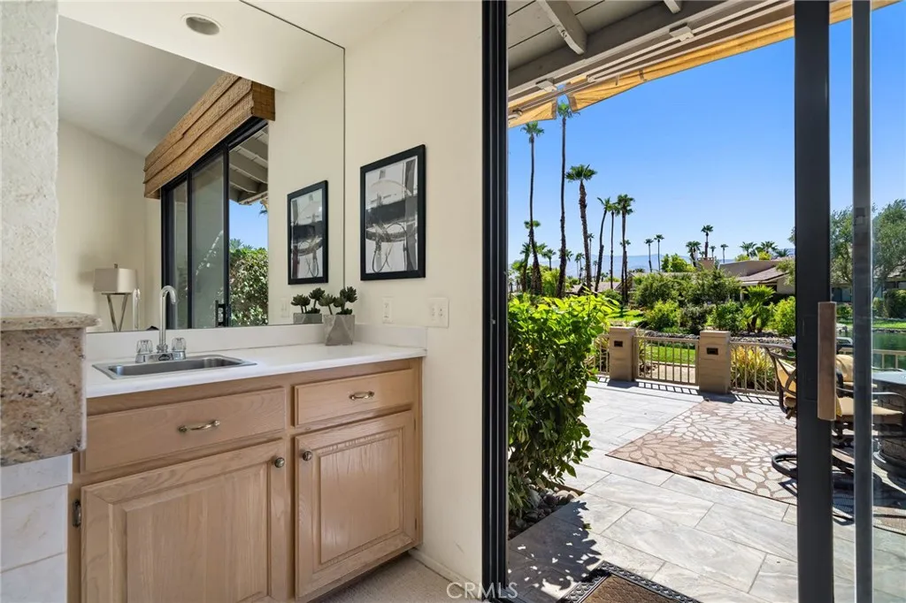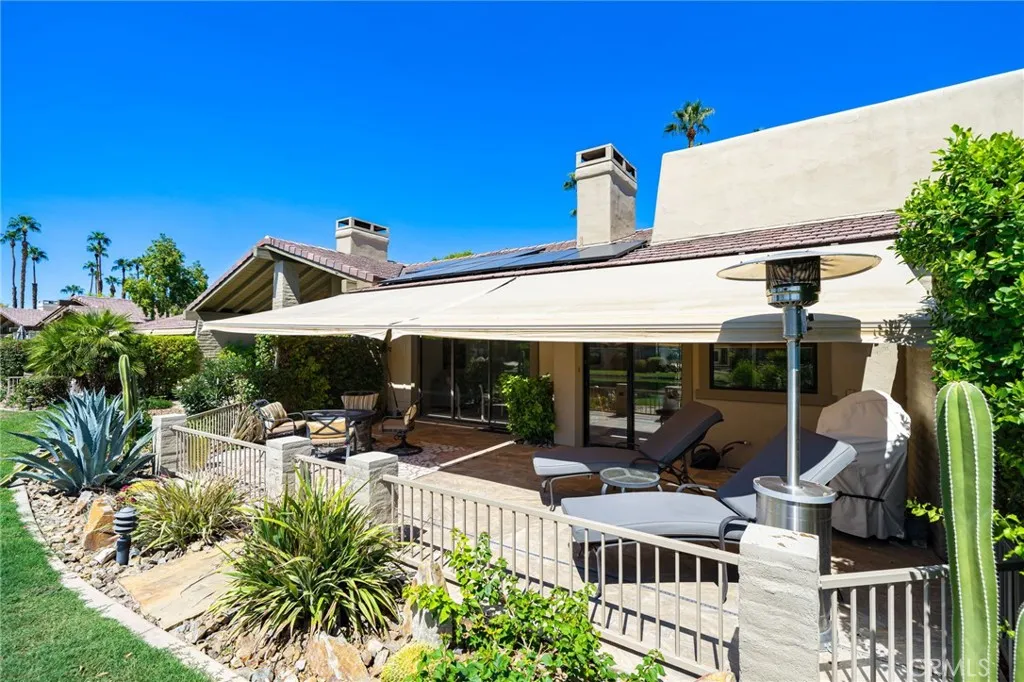 Welcome to The Lakes Country Club! This South-facing, waterfront, expanded Durango floorplan on one of the most popular streets in the community offers approximately 1,725 sq ft of living space. This home offers 1 primary suite, a den, currently utilized as a 2nd bedroom, and a large office/ flex space with a beautiful large skylight. The extended patio with newer tile flooring provides an attractive outdoor living space to savor morning coffee or evening sunsets while enjoying the scenic water and panoramic mountain views. The expanded kitchen is nicely appointed with custom cabinets, granite countertops, a newer Wolf gas cooktop, built-in oven, warming drawer and microwave and a center island with seating for small gatherings. The list of upgrades doesnt stop there: 14 OWNED SOLAR PANELS on 2.0 Net Metering, a welcoming paver driveway, plus the A/C and hot water tank were replaced in 2023. Wow, thats a lot of value! Dont miss your chance to own a gem in one of Palm Deserts most desirable communities. The Lakes Country Club offers a robust schedule of social and fitness activities at the exquisite Clubhouse and Health and Wellness Center. Enjoy Tennis, Pickleball or Pop Tennis, Bocce or the 44 community pools and spas. For golfers, the Club offers membership options for the 27 hole championship golf course.
